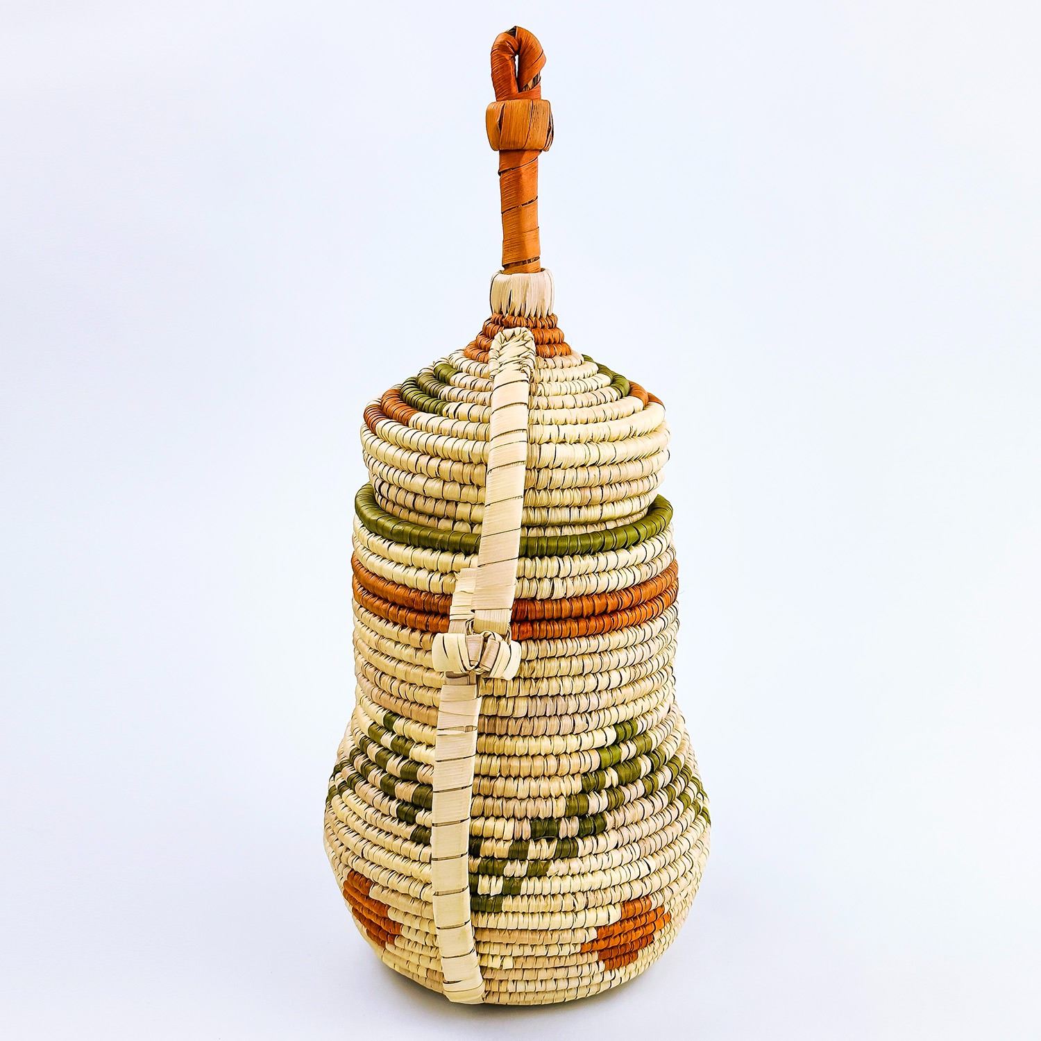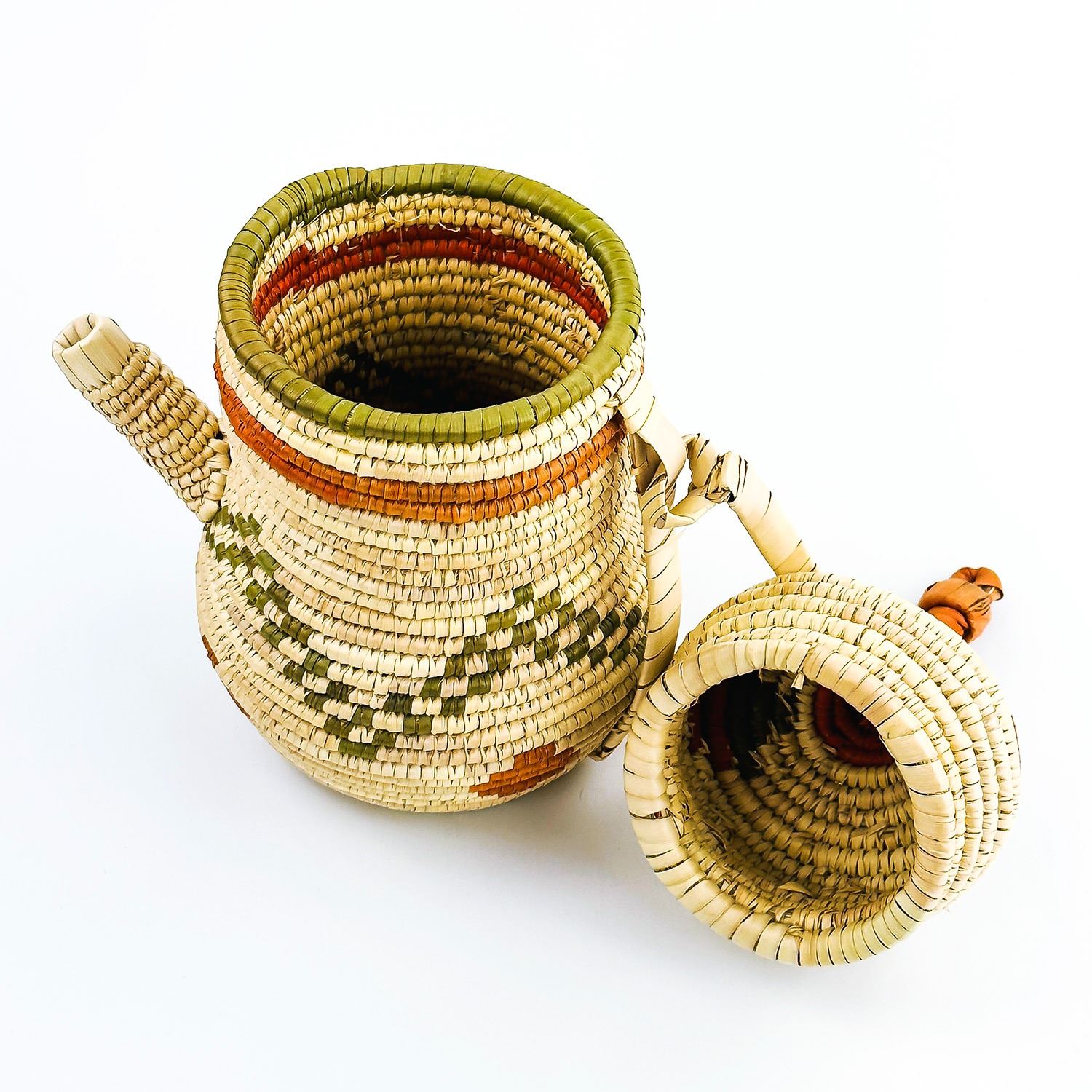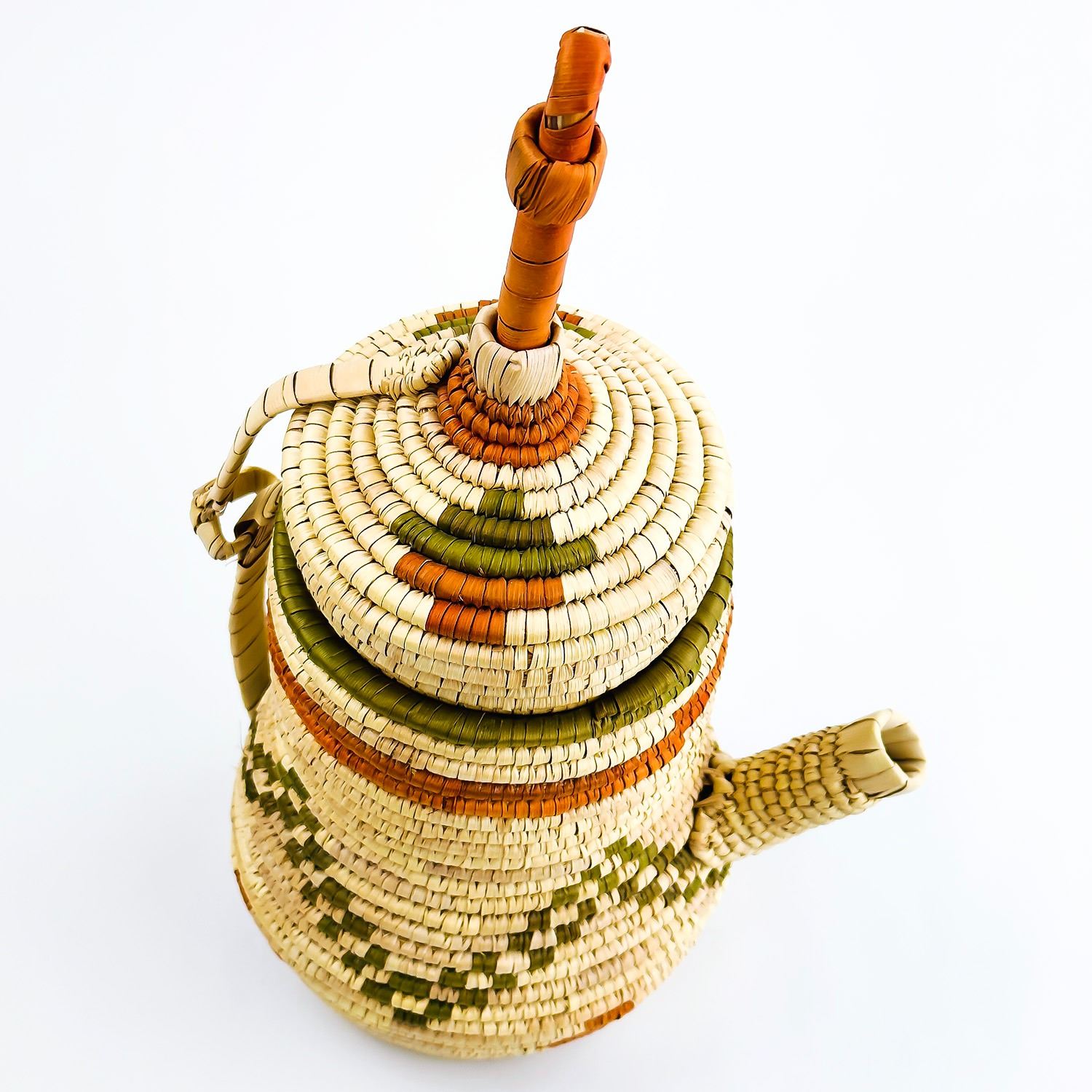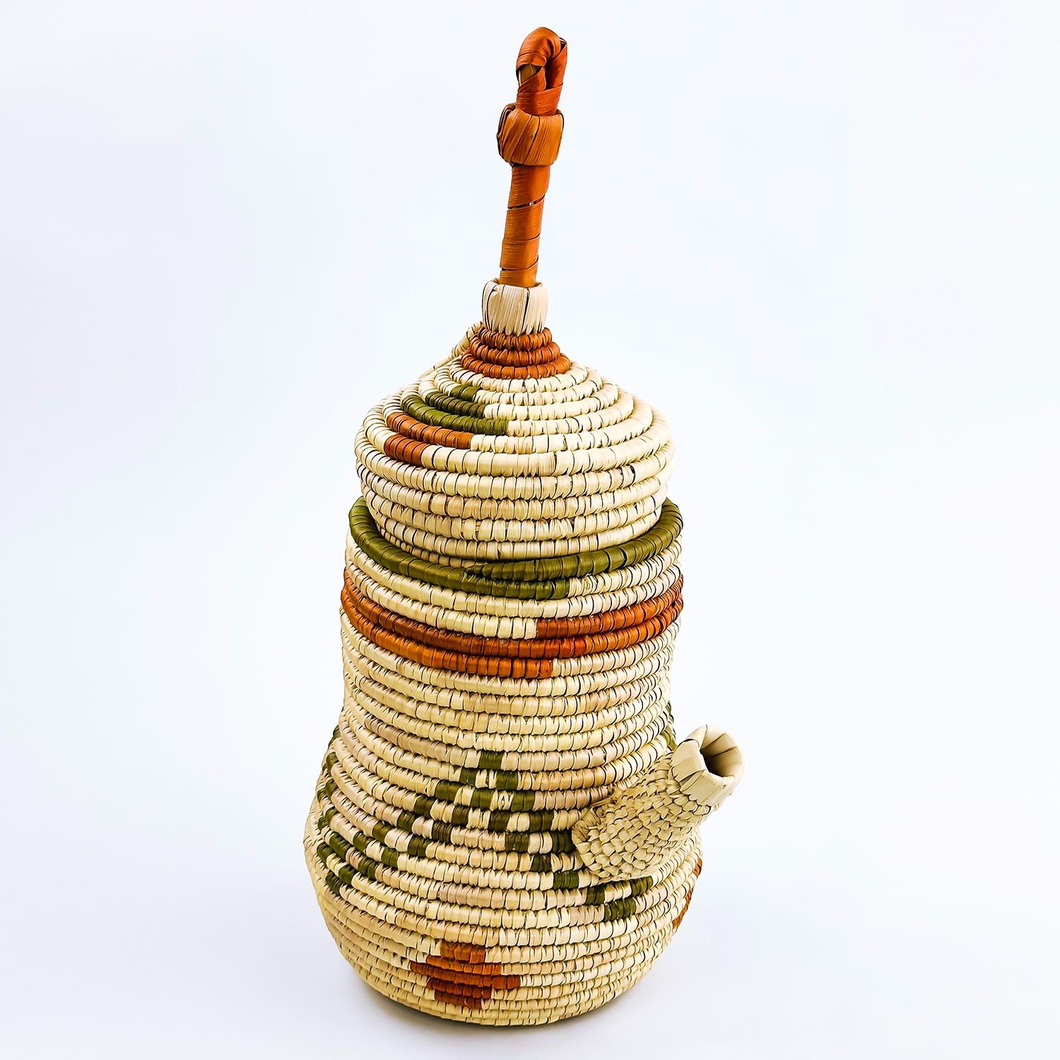#8097 - HAND CRAFTED COUNTRY HOME DECOR BASKET SCULPTURE - ORIGIN UNKNOWN. MEASURES: 12.5” (32 CM) HIGH BY 7.5” (19 CM) WIDE - INCLUDES SPOUT AND HANDLE.