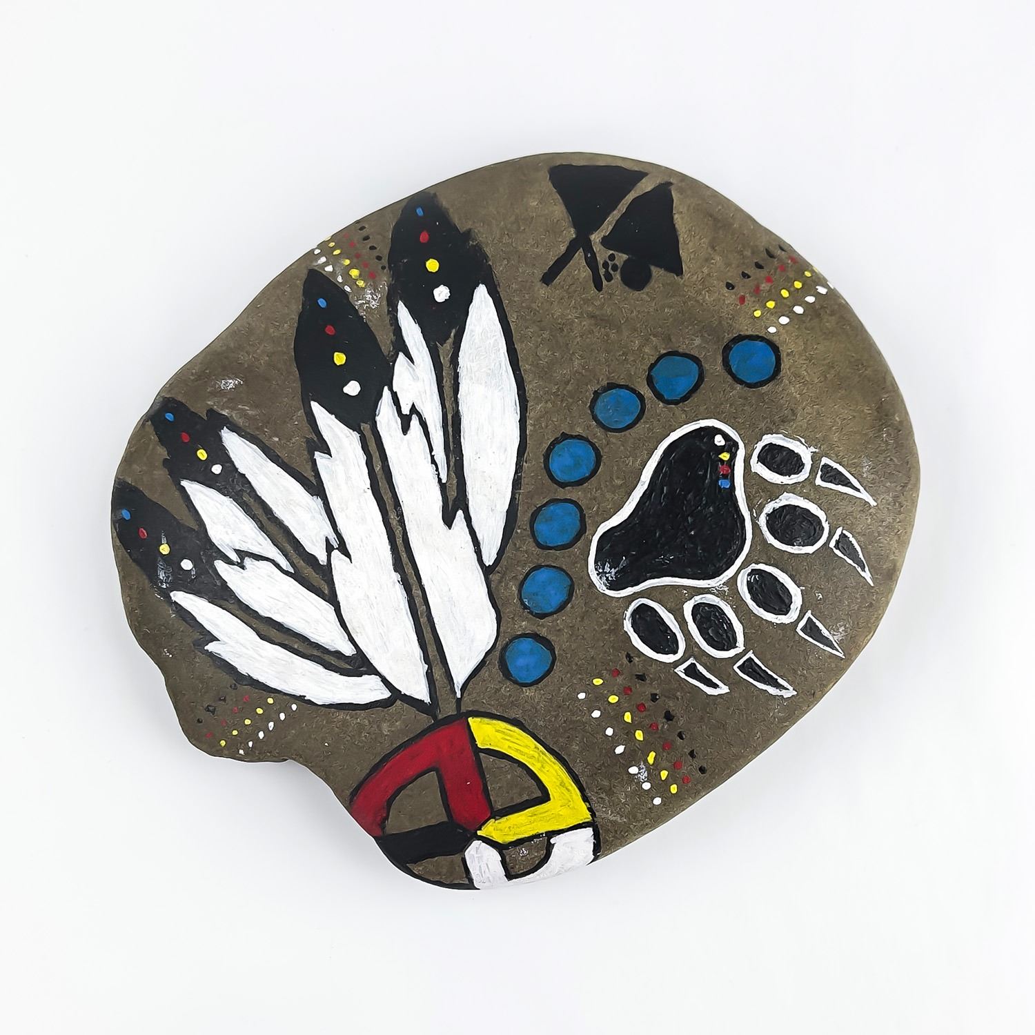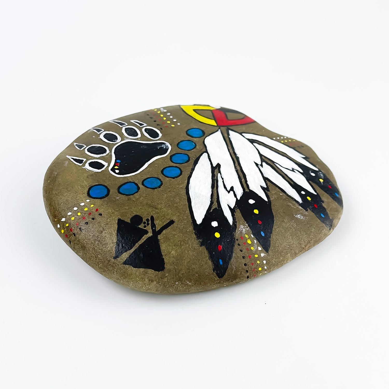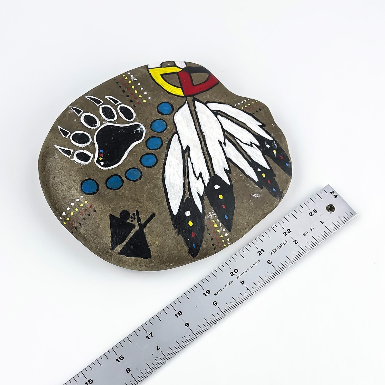 #9121 - HAND PAINTED 7.5” (19 CM) WIDE STONE. PAINTING FEATURES ARTISTIC INDIGENOUS MOTIFS - BEAR PAW PRINT, EAGLE FEATHERS, MEDICINE WHEEL, TEEPEE TIPI TEPEE. UNSIGNED - ARTIST UNKNOWN. COLLECTIBLE ONE-OF-A-KIND RUSTIC PAINTED ROCK ART SCULPTURE. HOME OR OFFICE DECOR PAPERWEIGHT. MEASURES 7.5” (19 CM) LONG BY 6.25” (16 CM) WIDE AND 1.25” (3 CM) THICK.
