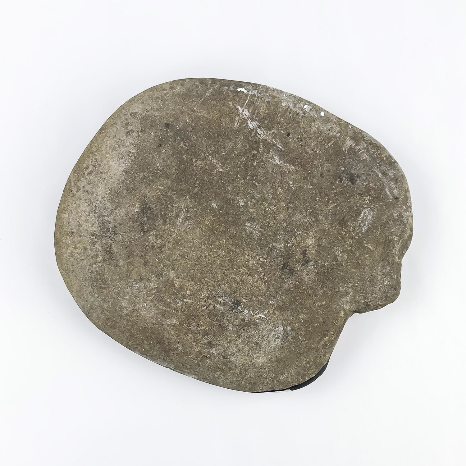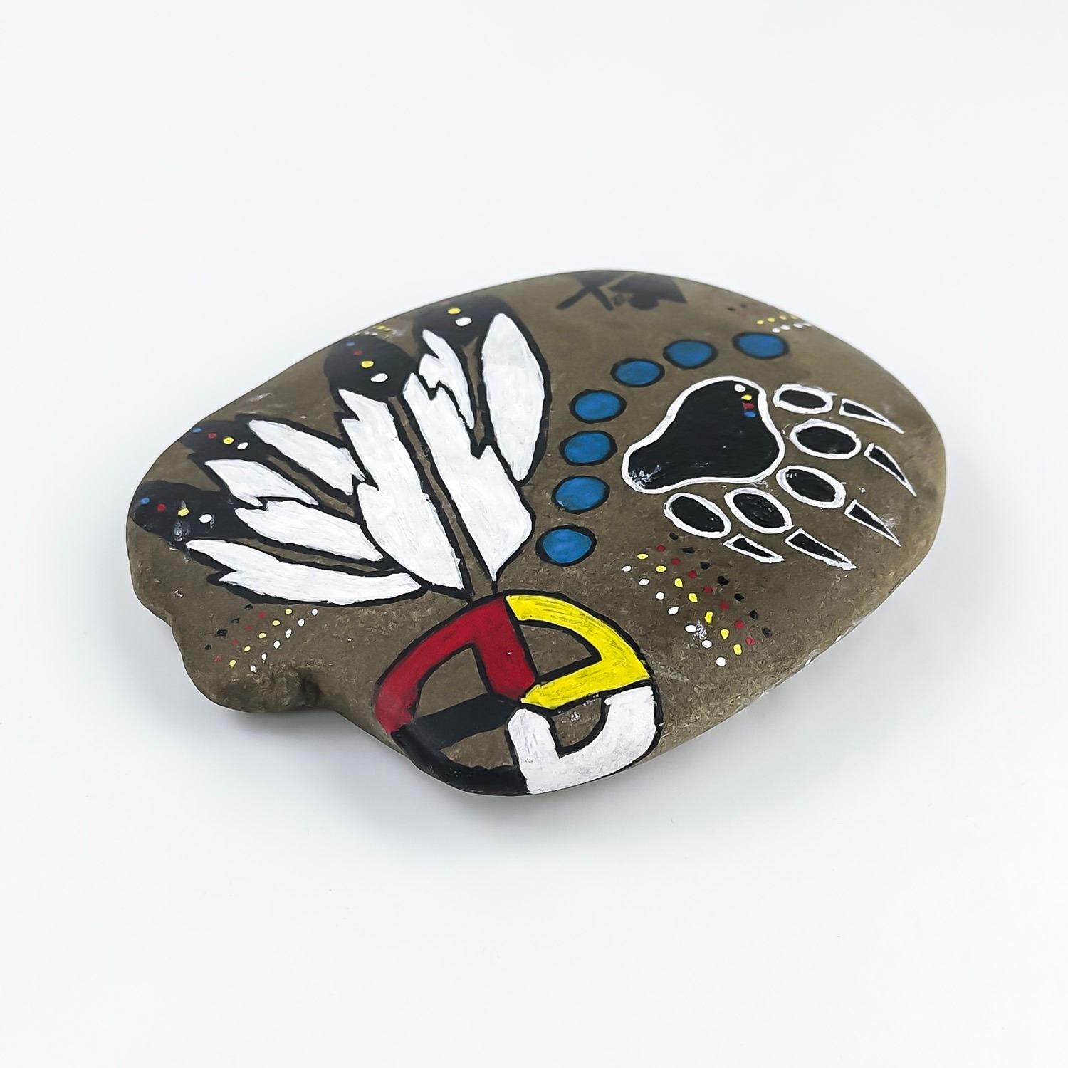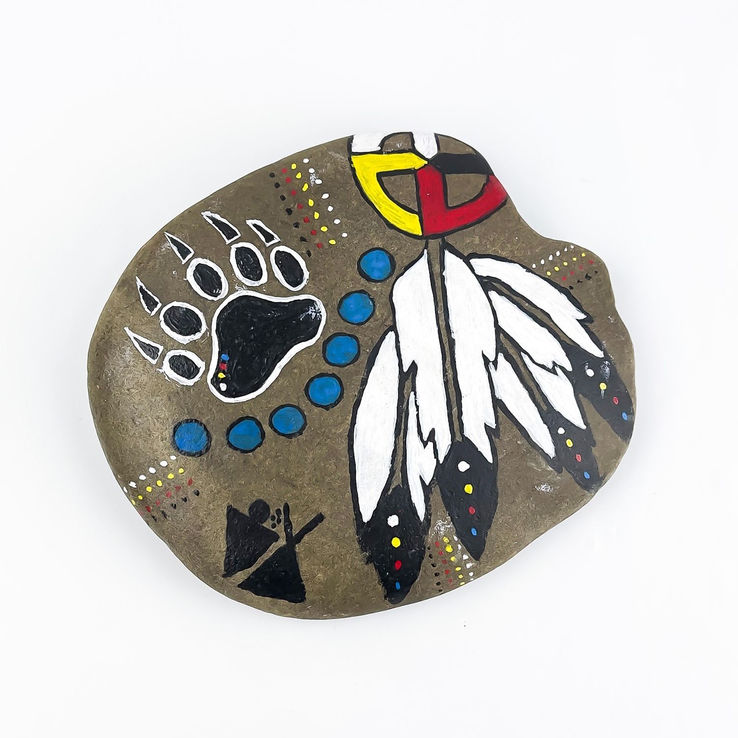 #9121 - HAND PAINTED 7.5” (19 CM) WIDE STONE. PAINTING FEATURES ARTISTIC INDIGENOUS MOTIFS - BEAR PAW PRINT, EAGLE FEATHERS, MEDICINE WHEEL, TEEPEE TIPI TEPEE. UNSIGNED - ARTIST UNKNOWN. COLLECTIBLE ONE-OF-A-KIND RUSTIC PAINTED ROCK ART SCULPTURE. HOME OR OFFICE DECOR PAPERWEIGHT. MEASURES 7.5” (19 CM) LONG BY 6.25” (16 CM) WIDE AND 1.25” (3 CM) THICK.