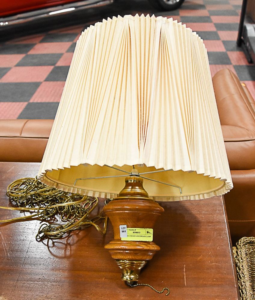 HANGING WOOD AND BRASS LAMP