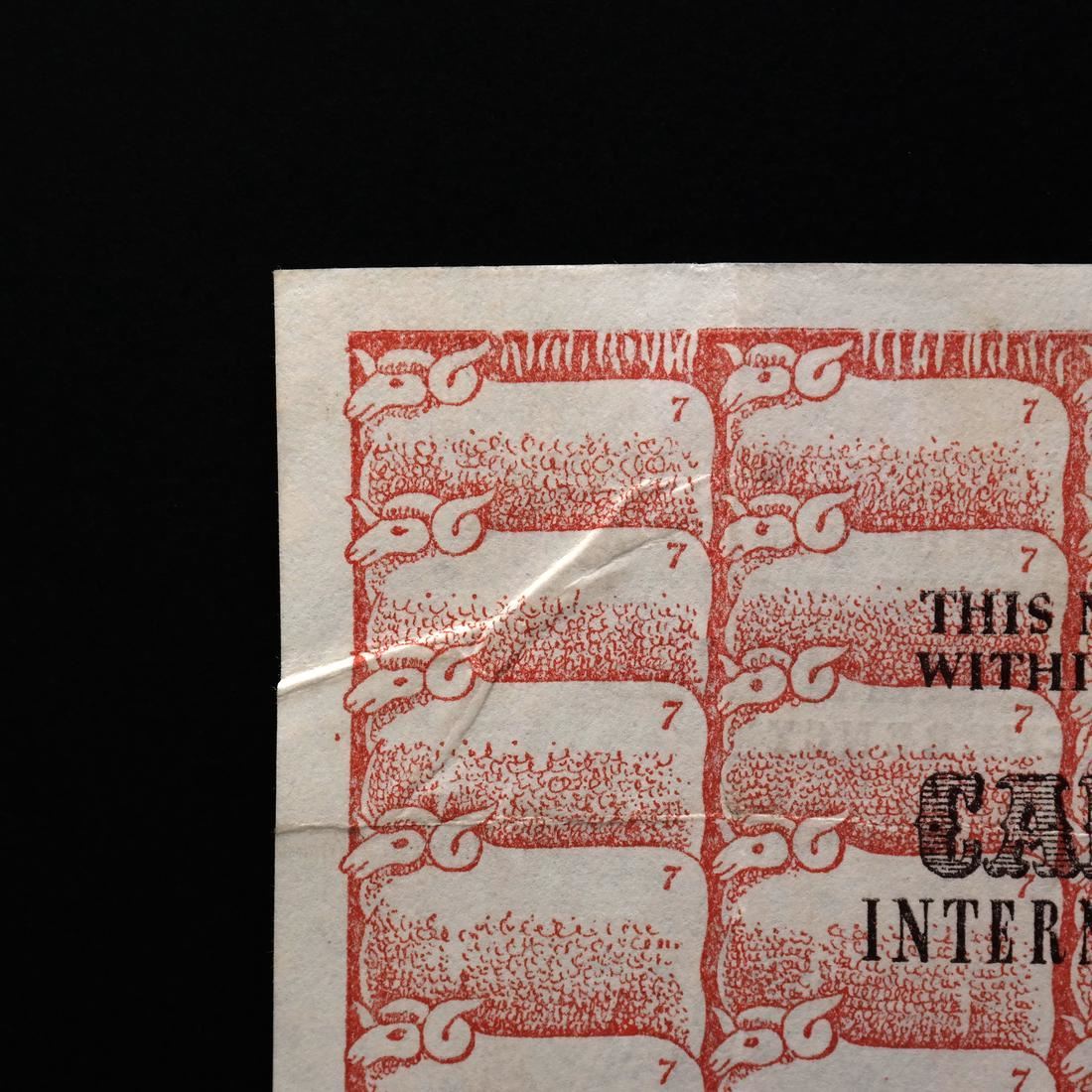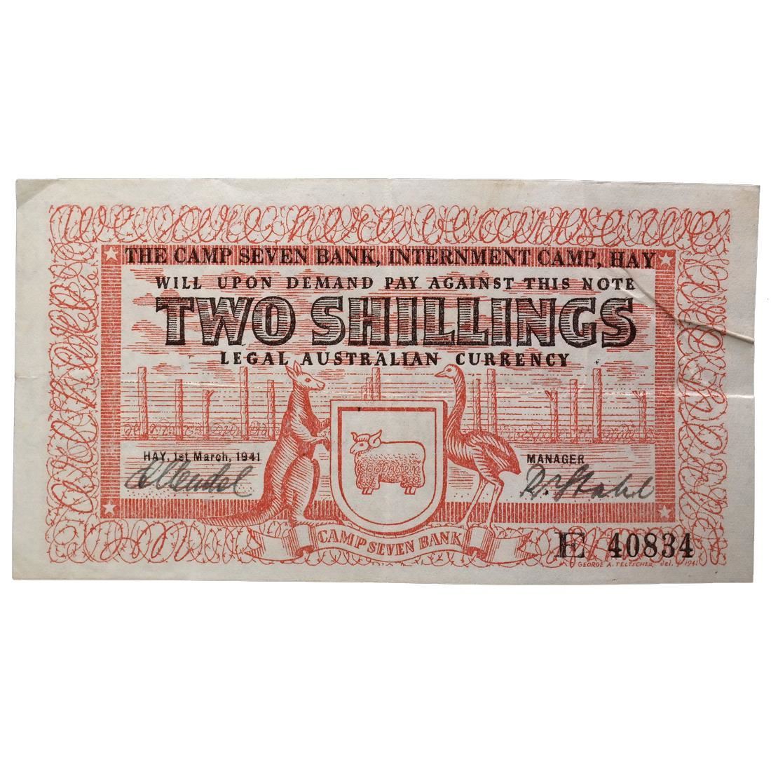 Camp Seven Bank, dated 1st March 1941, signed Mendel/Stahl, serial #E40834, SB-553a, light wrinkles and creases, Very Fine+ condition.