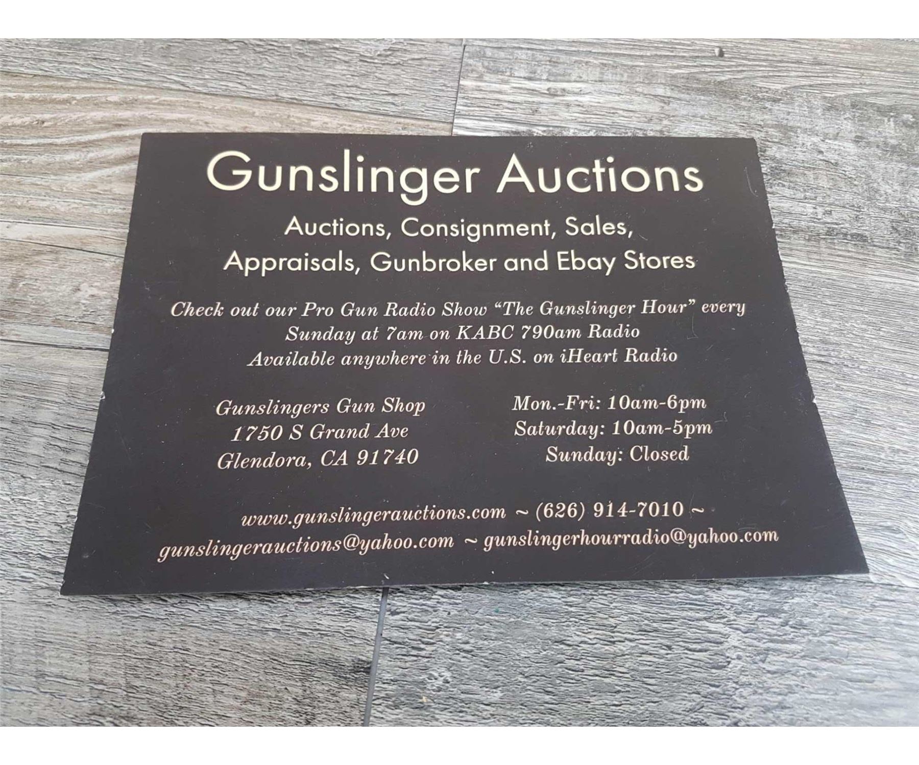 14. ALL FIREARMS WILL BE SOLD BY Gunslinger Auctions, a Federal Firearms License (FFL) Licensee in California. California BUYERS-Must pass the California Bureau of Investigations background check for all firearms. A $35 fee will be charged for the background check. If you do not pass the background check, you still must pay for the firearm(s), and they will be sold at a later auction and appropriate commission will be charged. Guns must be picked up by the purchaser at Gunslinger Auctions. All purchases will be charged to your credit card the day after the auction, once shipping charges are determined, your credit cards will again be charged for shipping. No one but the purchaser will be allowed to pick up the firearms. BUYER’S FROM OUTSIDE CALIFORNIA OR OUT OF AREA BUYERS- IMMEDIATELY FOLLOWING THE AUCTION YOUR CREDIT CARD WILL BE CHARGED FOR YOUR PURCHASES AND BIDDING FEE’S. YOU ARE REQUIRED TO Contact a Federally licensed firearm dealer in your state who will accept shipment and transfer the firearm to you in your state. YOU ARE RESPONSIBLE TO DETERMINE YOUR ABILITY TO PURCHASE A FIREARM IN YOUR STATE. IF YOU FAIL TO QUALIFY IN YOUR STATE YOU WILL THEN OWN A WEAPON THAT YOU CAN’T POSESS. ALL SALES ARE ABSOLUTELY FINAL ON THE DAY OF SALE. Gunslinger Auctions will arrange shipping on all firearms through a local pack/ship company or a national company of your choice. The cost of the shipping will be paid by the purchaser prior to shipment. HANDGUN’S REQUIRE OVERNIGHT SHIPPING. Visa, Master Card and American Express are accepted for payment. YOU MUST BE OVER 21 YEARS OLD TO BUY LONG GUNS. YOU MUST BE OVER 21 YEARS OLD TO BUY HANDGUNS ATF FORMS WILL BE FILLED OUT ON ALL GUNS, with the exception of pre 1898 antique's. Gunslinger Auctions has not fired any firearm in this auction (Unless otherwise noted). As such we cannot and do not warranty these items. Our conditions range from New in Box, Outstanding, Excellent, Very Good, Good, Fair & Poor. Please pay attention to our ratings. They are our opinions ONLY, so you should make every effort to inspect them yourselves.