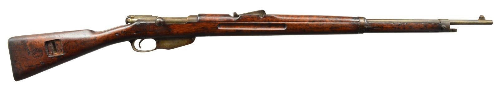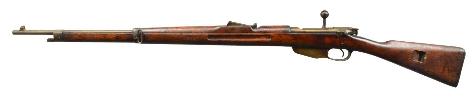 Cal. 6.5x53R. S# 6464P. Bbl. 31". Rifle mfg. at Hembrug. Receiver ring has additional 1947 date. Bolt assembly numbers do not match rifle. Straight bolt handle. Rear sight graduated to 2000m. Inverted V front sight. Cleaning rod is not present. Bayonet lug. Walnut stock set has been modified w/ mortise in buttstock to accept German style sling. Buttstock has filled sling swivel recess at belly. Buttstock is marked on right side w/ encircled “Hembrug” & “W” w/ 1917 date. CONDITION: stock has extensive wear, dents, scratches & staining w/ original finish. Metal has traces of blue turning overall gray & patina, w/ very light oxidation & wear. Fair, worn dark bore. (20-1447/RW). CURIO. $300-500.