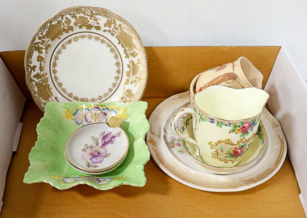 CREAM + SUGAR MINUET PATTERN, WADE BRAMBLE CREAM + SUGAR DISHES, ROYAL WINTER CREAM PITCHER, GERMAN GLASS TRIVET, GREEN JAMES KENT CANDY DISH