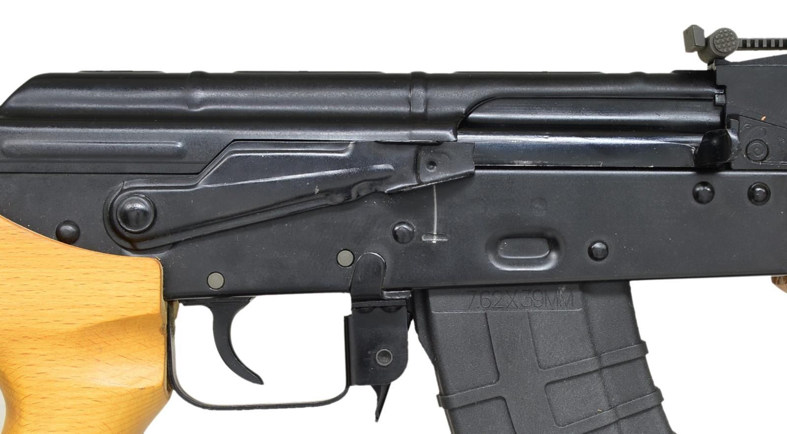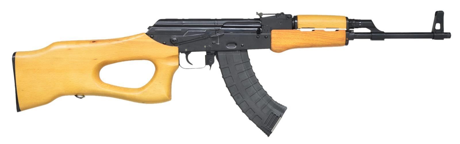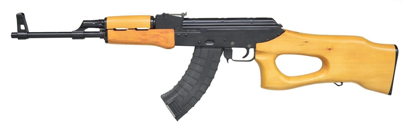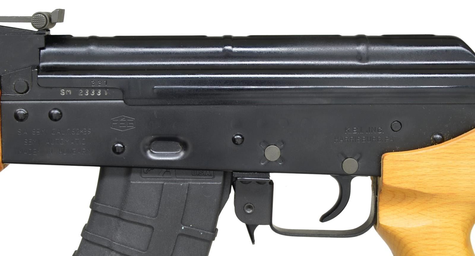 HARDWOOD FURNITURE. Cal. 7.62x39. S# SM23331. Bbl. 16". A Hungarian AK47 variant w/ attractive blonde sporter furniture. Imported through KBI, this piece has no threads on the muzzle nor a bayonet lug present. Left side sling swivel in front of handguards & rear bottom sling swivel on shoulder stock. Protected post front sight & rear tangent sight scaled to 1000m. Stamped receiver. Right side controls. Dark black painted finish on all exposed metal surfaces. MAGS: 1 Tapco 30 rd. & 1 metal 30 rd. UNATTACHED ACCESSORIES: Allen canvas transport bag & black plastic transport case. CONDITION: all outward aspects indicate very little usage if any at all. No finish wear or imperfections in furniture are noticeable. Light thinning between selector & receiver further illustrates low use. (21-762/JZ). MODERN. $400-600.