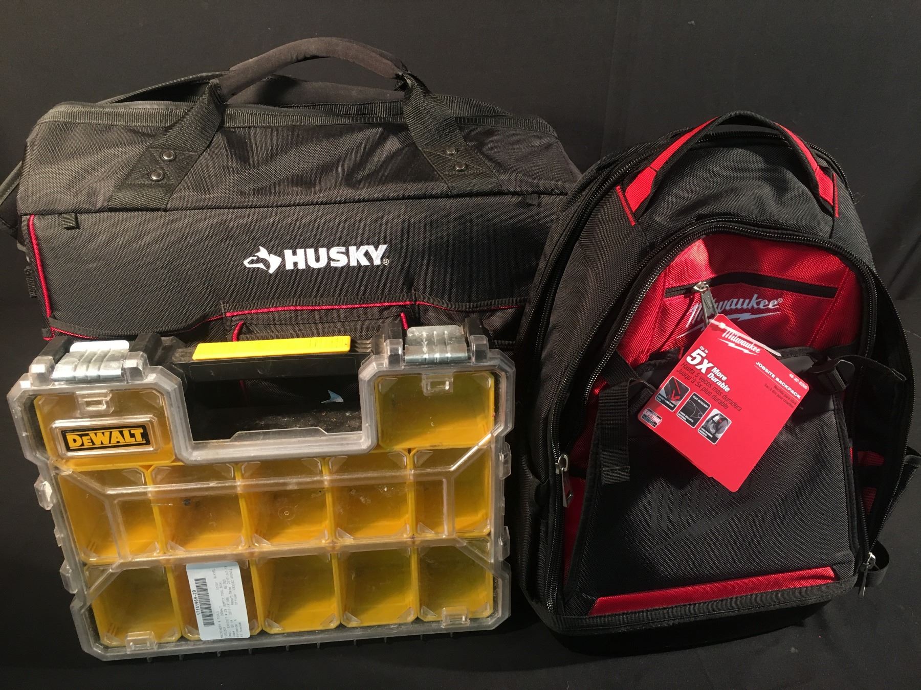 HUSKY TOOL BAG, DEWALT PARTS CASE & MILWAUKEE JOB SITE BACKPACK