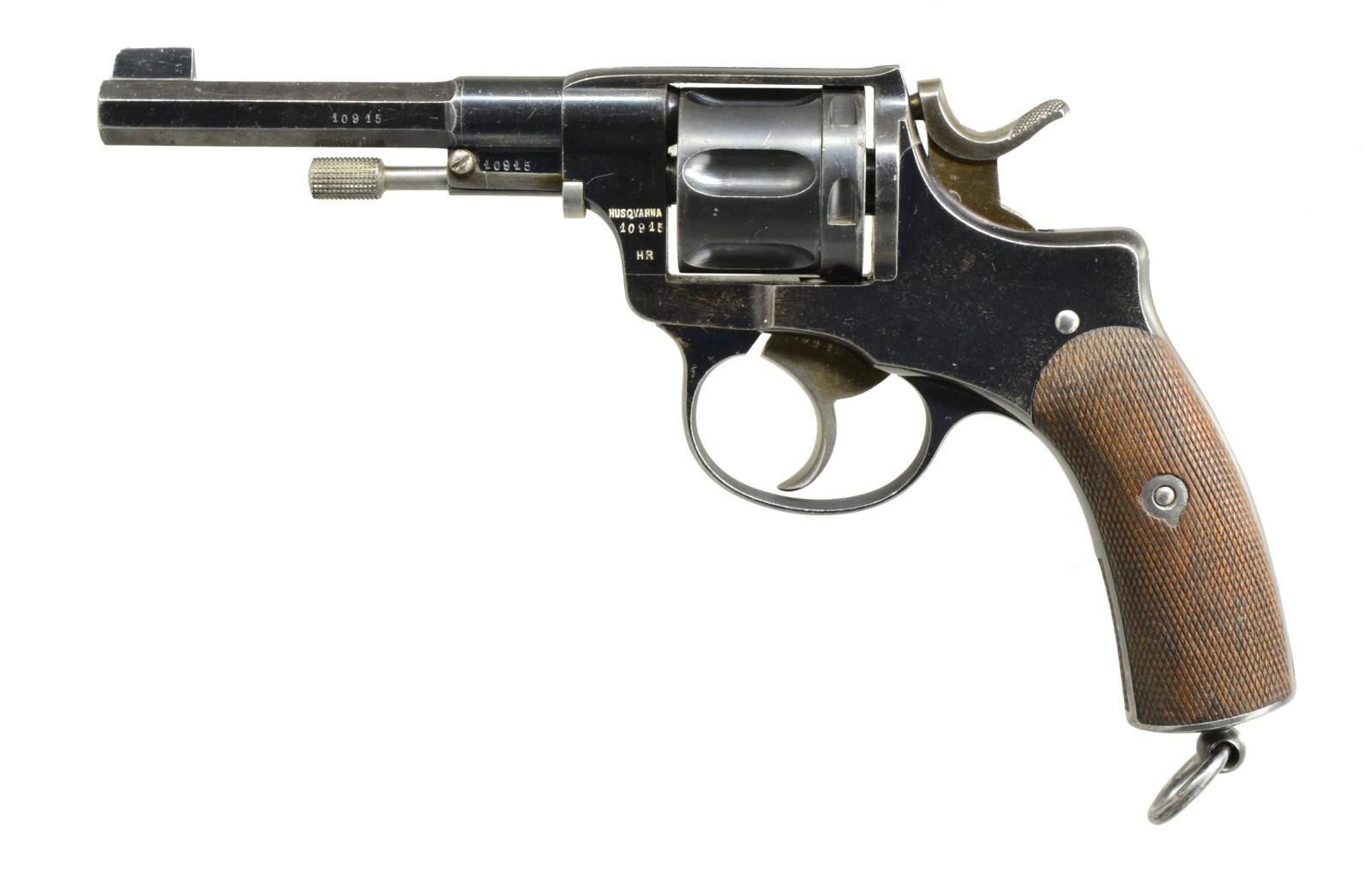 Cal. 7.5x23R. S# 10915. Bbl. 4 1/2" oct. Mfg. 1897-1905; still in service w/ Swedish reserve until 1947. Checkered walnut grips w/ capped butt having lanyard loop. Originally constructed by Nagant brothers in Liege beginning in 1887, before Husqvarna of Sweden. Visible matching numbers on bbl., cyl. pin lock, frame, loading gate & trigger. Straw colored hammer, trigger, loading gate & spring. Flat on right side of frame above grip has unit marking of “L N o. 136 / A”; area has appearance of prior marking w/ frame reduced & new marking applied, leaving area having a dull in the white appearance. Mismatched cyl. numbered 7091. CONDITION: very good general appearance; Swedish quality finish of original appearance, except noted in the white section. Very nice straw colors. Very slight high point thinning & numerous very light marks throughout. Good to very good bore w/ occasional spot of light pitting. (20-3704/NW). CURIO. $300-500.