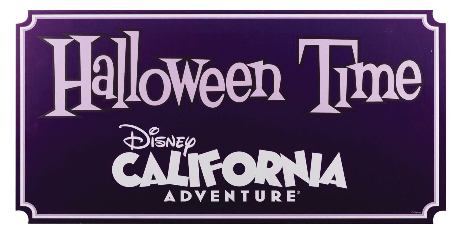 (California Adventure, 2010s) A sign created to herald Halloween Time at California Adventure. Measuring 36" long and 18" tall, the acrylic sign is in very good condition with few scratches, scuffs light wear, and two plastic adhesive-backed mounts on reverse from original Park display.