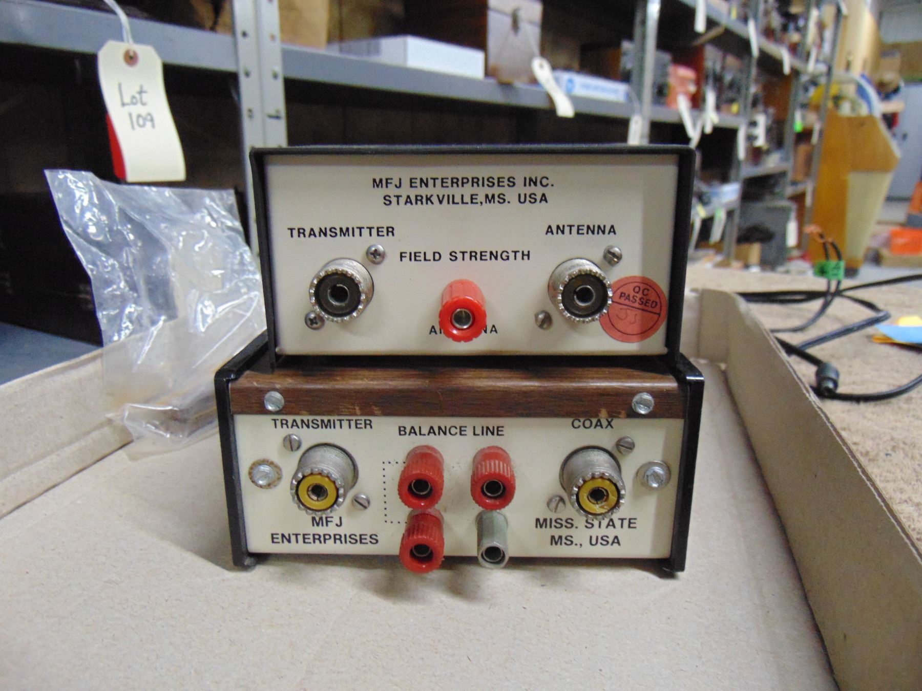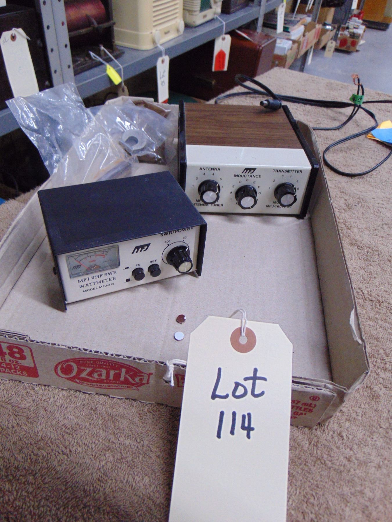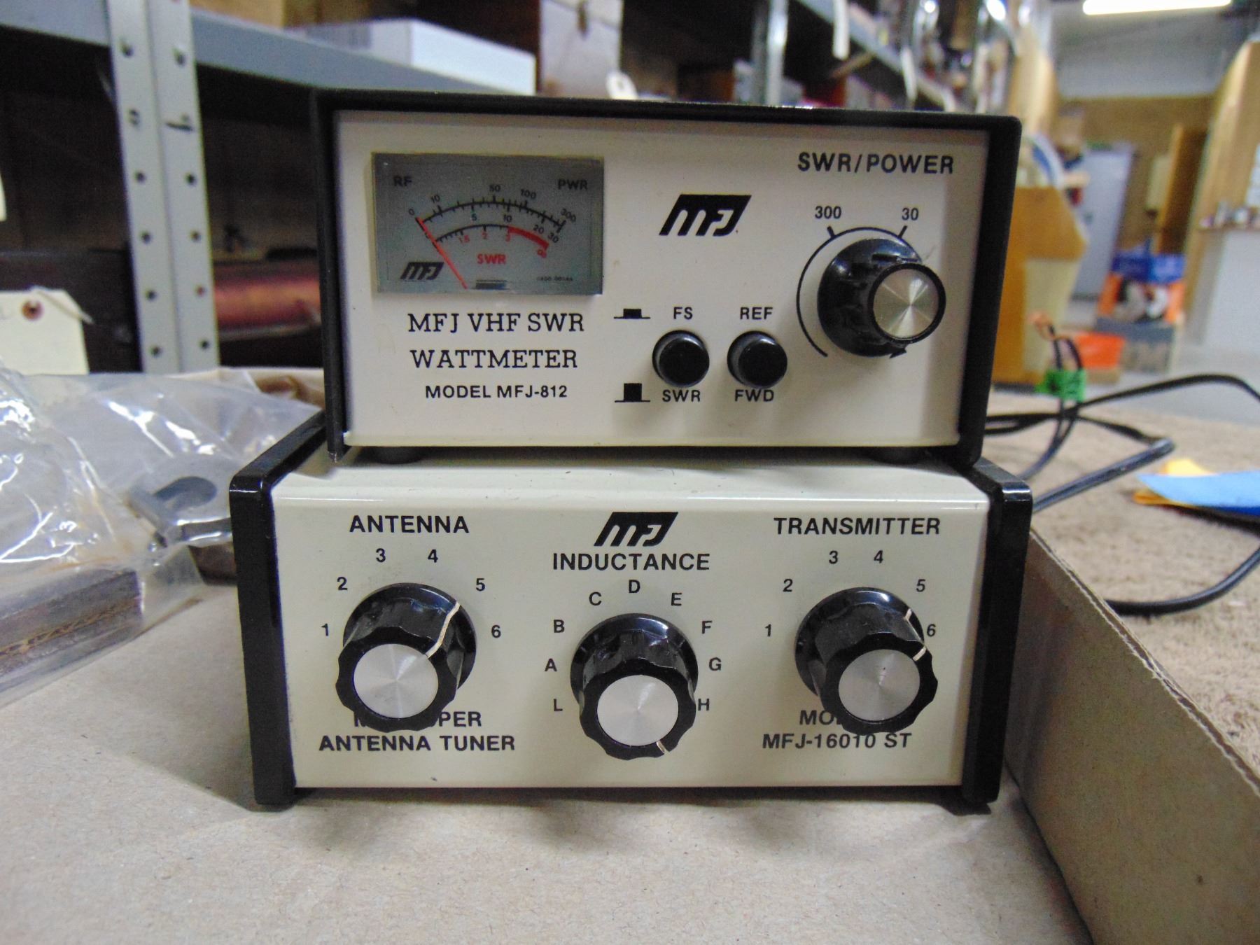 Flat of misc ham items; includes MFJ antenna tuner, MFJ VHF watt meter