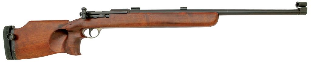 serial #300-247, 7.5 Swiss, 29 1/2" heavy barrel with a bright near excellent bore. The metal surfaces on this single shot rifle with straight pull bolt retain about 95% original thinning blue with areas of mottled patina on the top of the barrel. The heavy hardwood target stock rates very good with moderate handling marks and flakes in the finish. The pistolgrip thumbhole stock is setup with a raised left-side cheekpiece and an adjustable buttplate which wears a Pachmayr Sure Grip rifle butt pad and provides a 14" length of pull to the adjustable trigger, housed in an aluminum triggerguard. The stock also features a full length accessory rail under the heavy target forend. This rifle is equipped with a globe front sight with target insert; no rear sight is present but the barrel features two target blocks awaiting your choice of competition optics. (21A11739-118) {C&R} [Richard "Stretch" Kennedy Collection] (1000/1500)