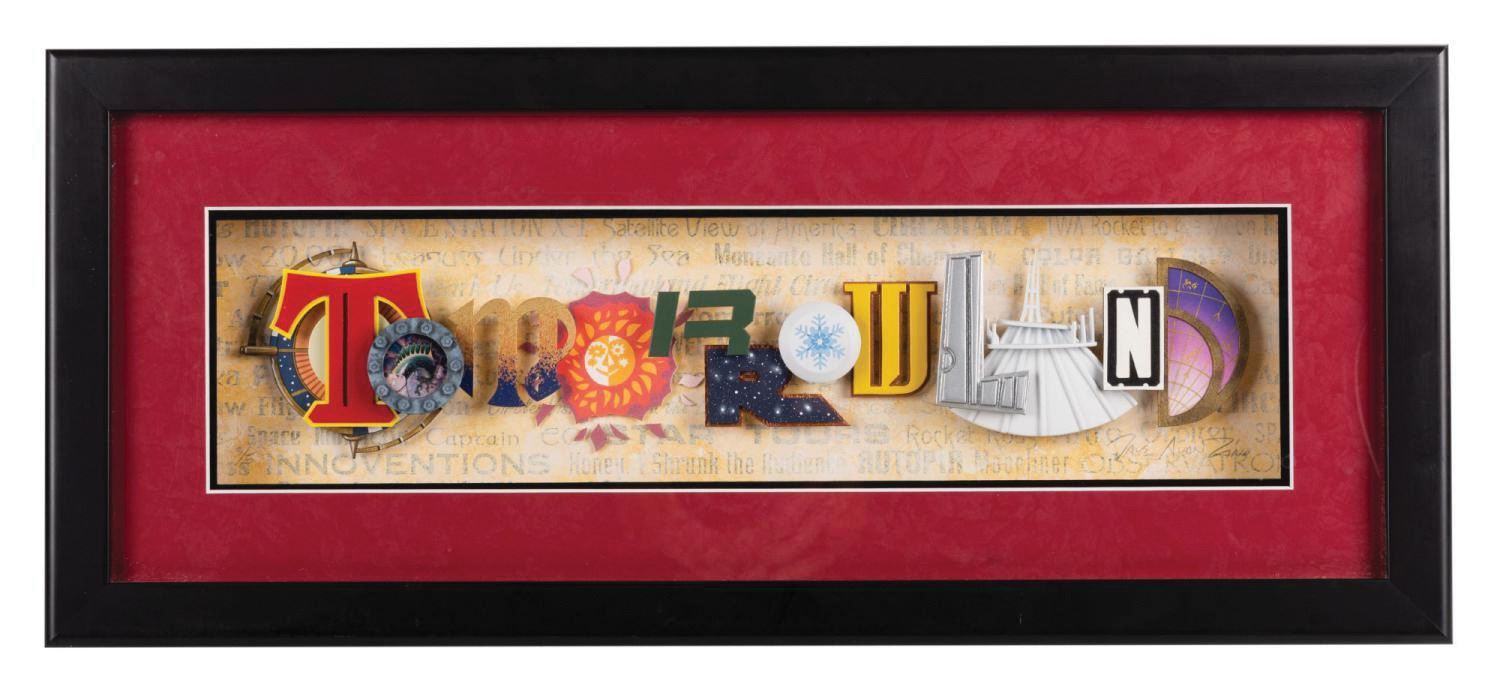 (Disneyland, c.2000) A hand-crafted and signed original Disneyland Tomorrowland Shadowbox personally created by mixed media artist Dave Avanzino in celebration of the 45th anniversary of Disneyland. In what would become the first model in a series of Icon Letters shadowboxes, Avanzino personally handcrafted the name of the timeless land from iconography borrowed from memorable Tomorrowland attractions like the golden sun of Mary Blair's "Spirit of Creative Energies…" murals or a snowflake from the world of Monsanto's Adventure Through Inner Space. Measuring approximately 10"x23.75 and 2" deep, the shadowbox is in very good condition retaining the artist's annotation "Dave Avanzino Disneyana Convention 2001" on the reverse.
