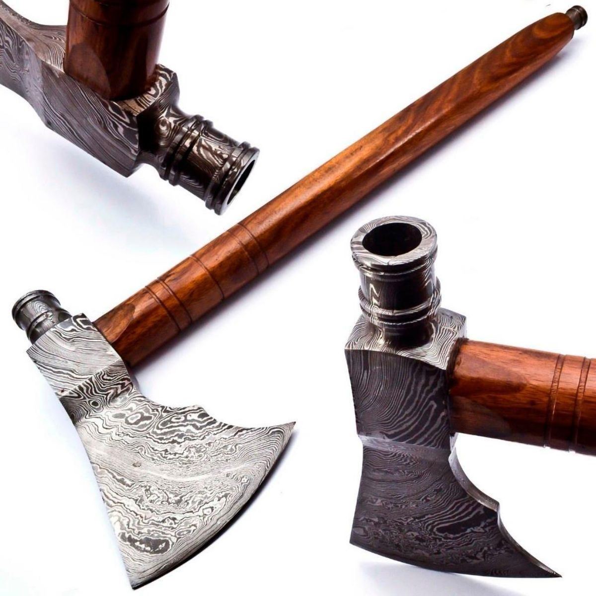For Auction Is A Stunning Handmade Damascus Axe Paired With a Handmade High Quality Genuine Leather Sheath. Each blade is created Using 256 Layers Of 1095 and 15N20 High Carbon Steels​​​​​​ To Produce A Superior Edge And Maintain A High Tensile Strength In the Steel. The Handle Is Made Of Select Rose Wood And Turned To Produce A Stunning Flat Finish Custom Handmade Damascus Steel Axes Knife With Smoke Pipe Poll Handle Rose Wood. Damascus Steel Blade with 256 Layers on it. HARDNESS 56-60 H R C VERY HIGH QUALITY GENUINE LEATHER SHEATH SIZE: Overall Length: 18.00″ Blade Cutting Length: 4.5â€