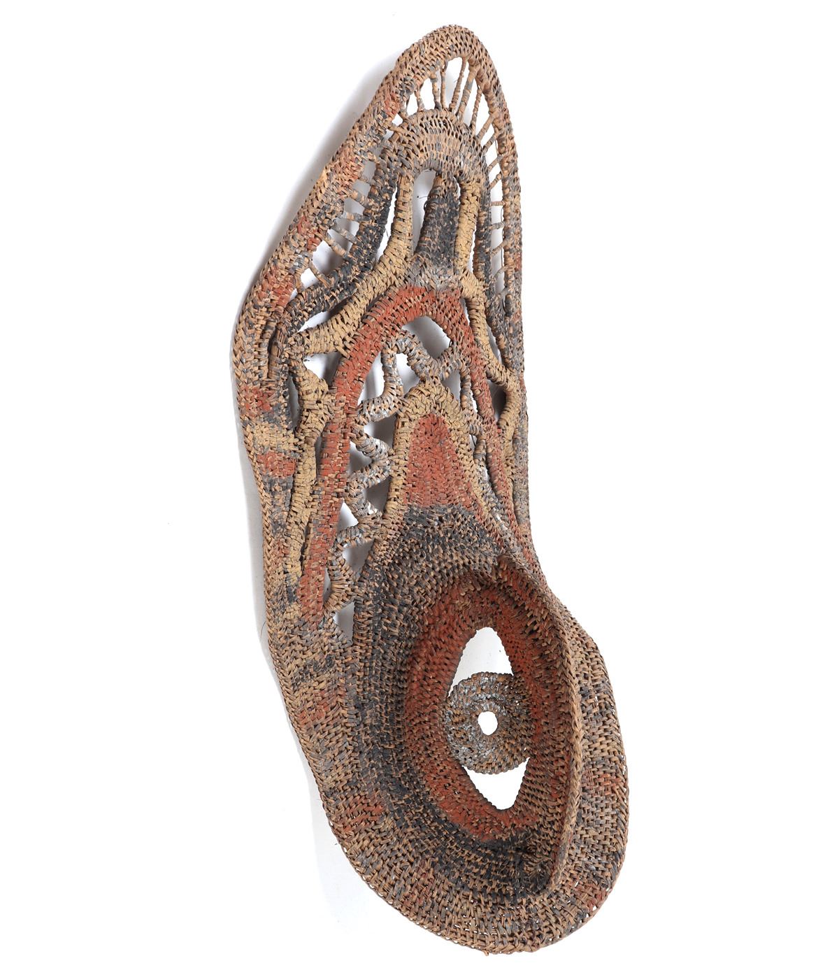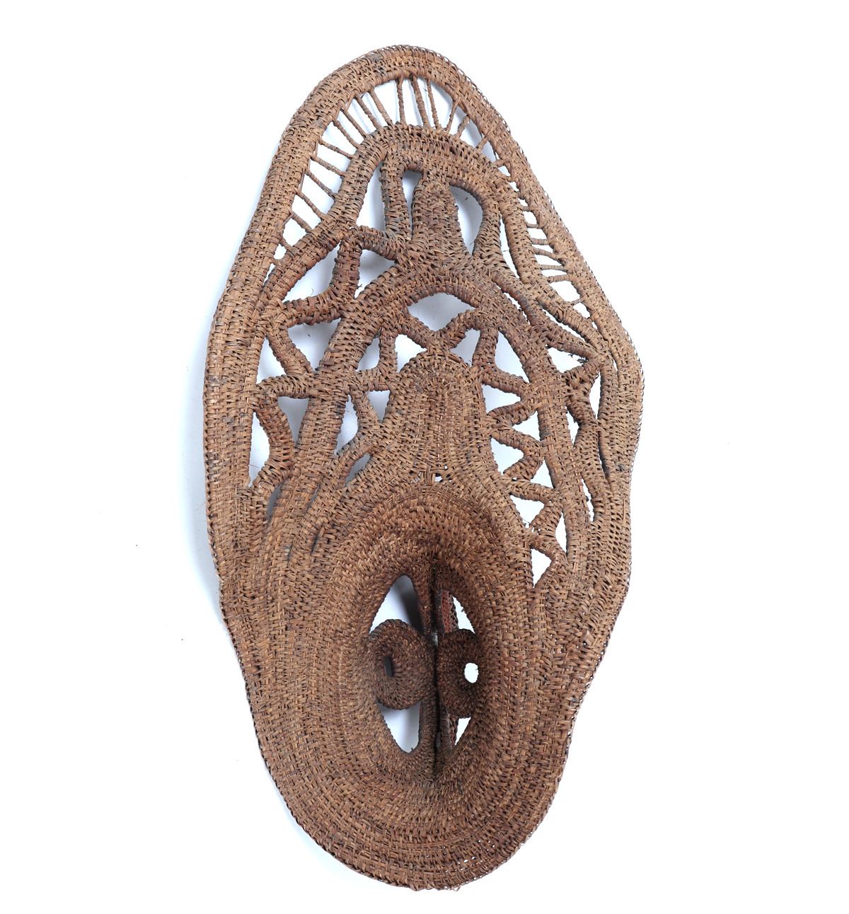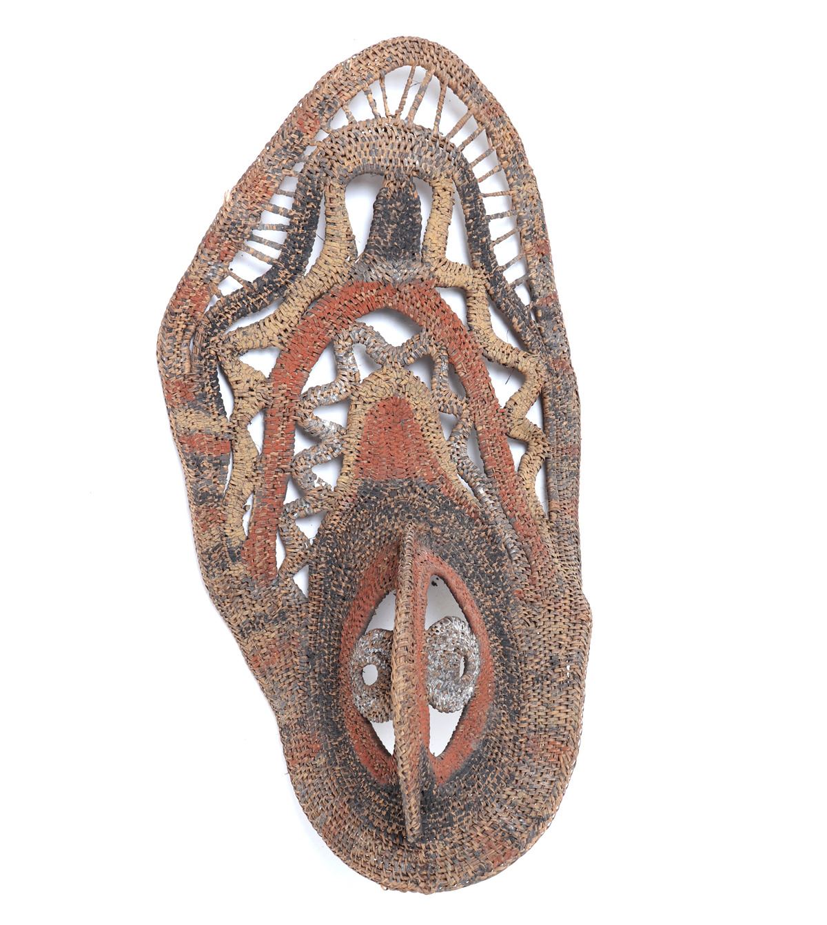 Late 20th century. Abelam people, Papua New Guinea. Very nice and expertly sculpted ceremonial yam mask comprised of wood, fiber and cane. Natural earth pigment accent the mask throughout in black, yellow and burnt orange. Classic avian form with a wide pointed beak. Size 23 1/8" L. Condition: Minor losses to pigment else in well preserved overall condition.. Provenance: Collected prior to 2008, ex-Lacy Gallery (Vanna & Lee Lacy collection), Los Angeles CA. Lacy Gallery was founded upon six decades of collecting ethnographic and fine art. Lee Lacy was a distinguished Hollywood producer of iconic TV series and commercials.