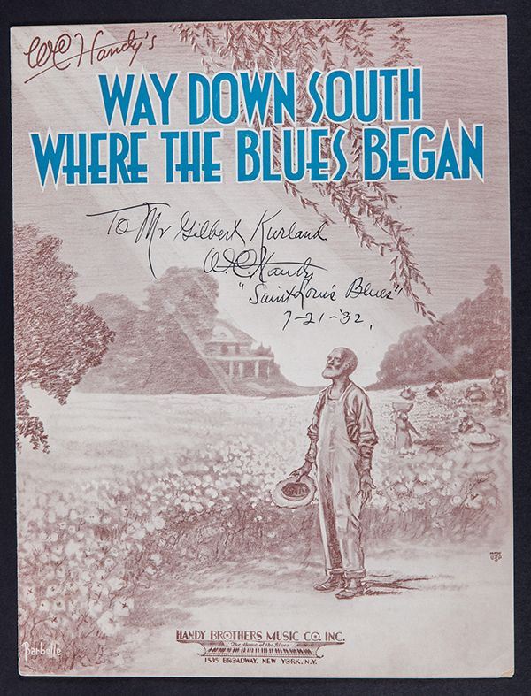 Handy, W.C (1873-1958) Influential American blues composer and musician, known as the "Father of the Blues." Sheet music for "Way Down South Where the Blues Began" inscribed and signed, "To Mr. Gilbert Kurland / W.C. Handy 'Saint Louis Blues' 7-21-'32." Sound engineer Kurland was twice nominated for an Academy Award. With a Handy Brothers Music Co. flyer offering W. C. Handy arrangements of Negro Spirituals and an "Aframerican Hymn."