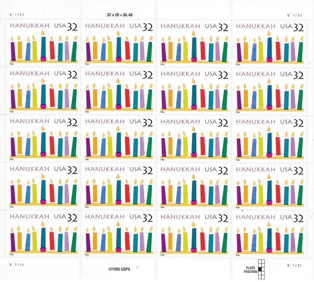Hanukkah 20 x 32¢ Stamps U.S. #3118. On October 22, 1996 in Washington DC; the USPS began a new series: HANUKKAH HOLIDAY CELEBRATIONS with a 32 stamp depicting the Jewish Festival of Lights. This stamp was a joint issue with Israel, the first between the two countries