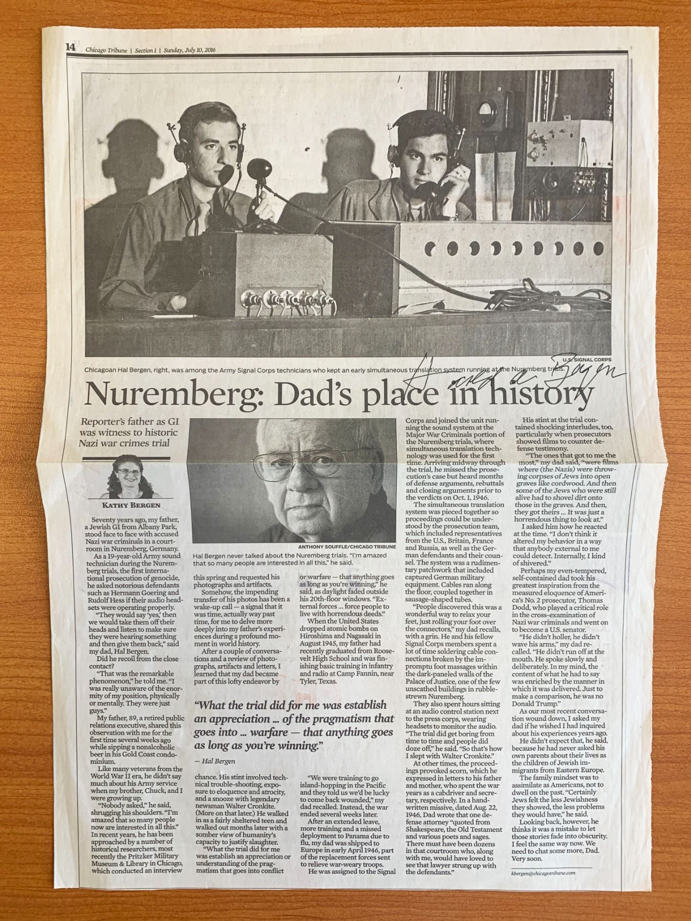 Harold Bergan Signed Newspaper Page. Chicago Tribune Sun. July 10 2016. 11x16 inches