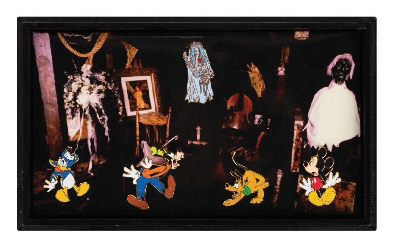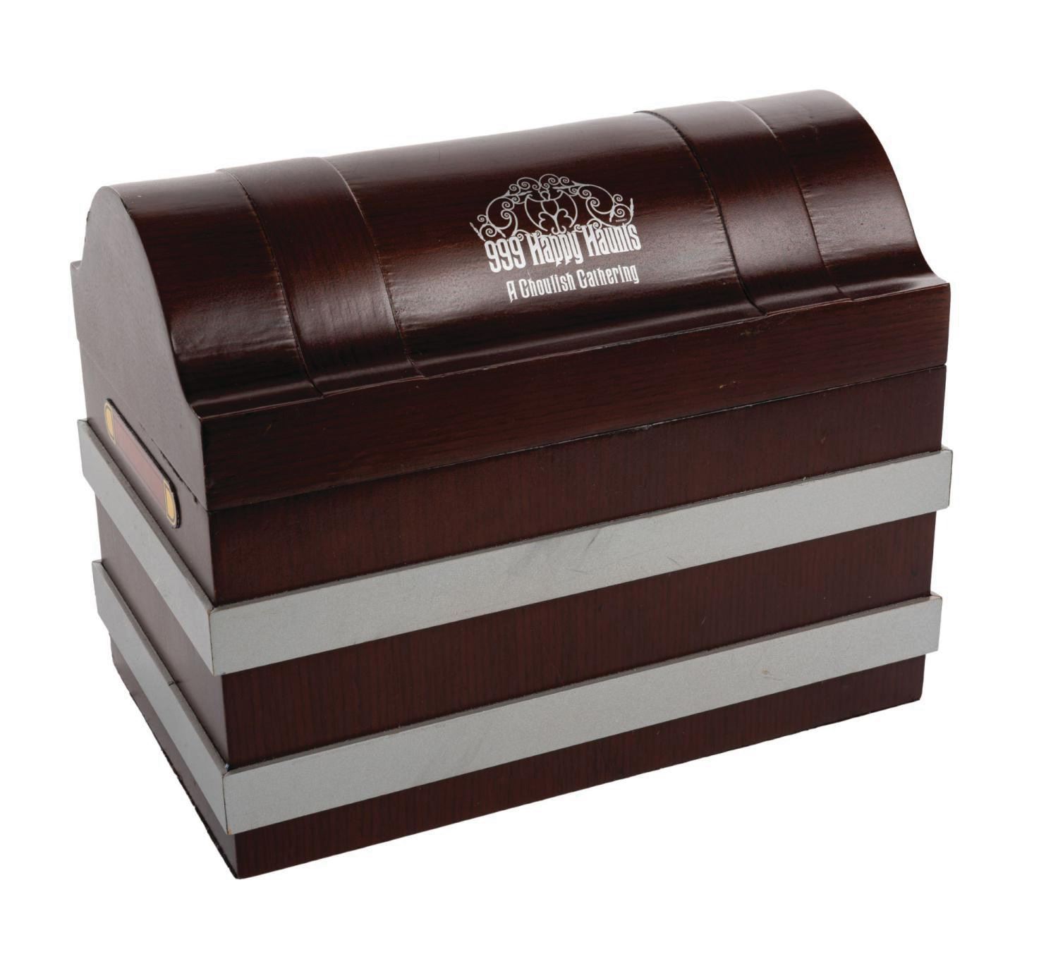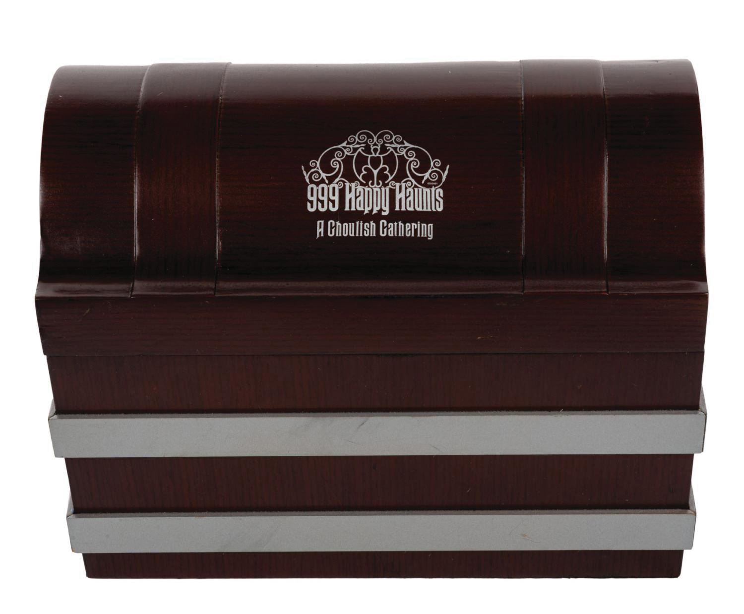 (Walt Disney World, 2004) A Haunted Mansion pin box set that was presented to Disney Legend Harriet Burns during the 999 Happy Haunts: A Ghoulish Gathering Event. Recognized as the first female Imagineer, Burns was pivotal in the creation and development of many of the Park's original attractions, including the Haunted Mansion. Titled "A Frightening Appearance," the event exclusive pin set is housed in a vintage-style trunk and was limited to 350 pieces. Measuring 6.25"x10" and 8" tall in its box, the set is in very good condition with minor box wear.