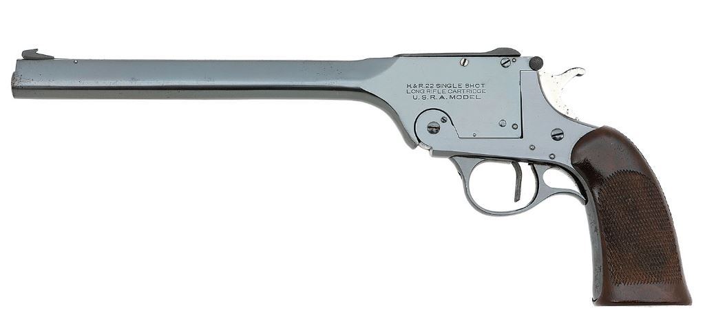 serial #2115, 22 LR, 10'' barrel with an excellent bore. This lovely Model 195 shows light use and remains in excellent condition. The metal surfaces retain about 98% original blue showing light edge wear, very light freckling, and a few handling marks. The checkered one-piece factory walnut grips rate near excellent showing light handling marks on the butt. The barrel and top latch are correctly numbered to the gun, barrel to frame fit is tight, it has the rectangular ejector, elevation adjustable undercut Patridge front sight, fully adjustable rear sight, and serrated target trigger. The barrel pivot screw shows slight slot damage although the rest of the screws are clean. The pistol includes the original factory two-piece box that is correctly end labeled and numbered to the gun, spare checkered factory grip, and handmade holster. The box rates poor with all the corners failed and the sides flare outward, the label is legible but the period repair cellophane tape over it has severely yellowed. The spare grips have been moderately modified with a file, coarse checkering added to the backstrap, and ad-hoc finger and thumb rest cut into it. The black leather custom open top holster rates excellent. The U.S.R.A. was precision built under the watchful eye of Walter Roper to win matches. (8A11482-1) {C&R} (1000/1500)