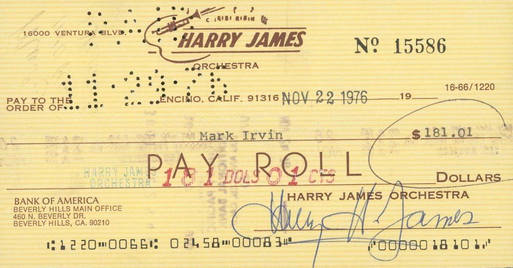 Harry James signed check dated November 22, 1976