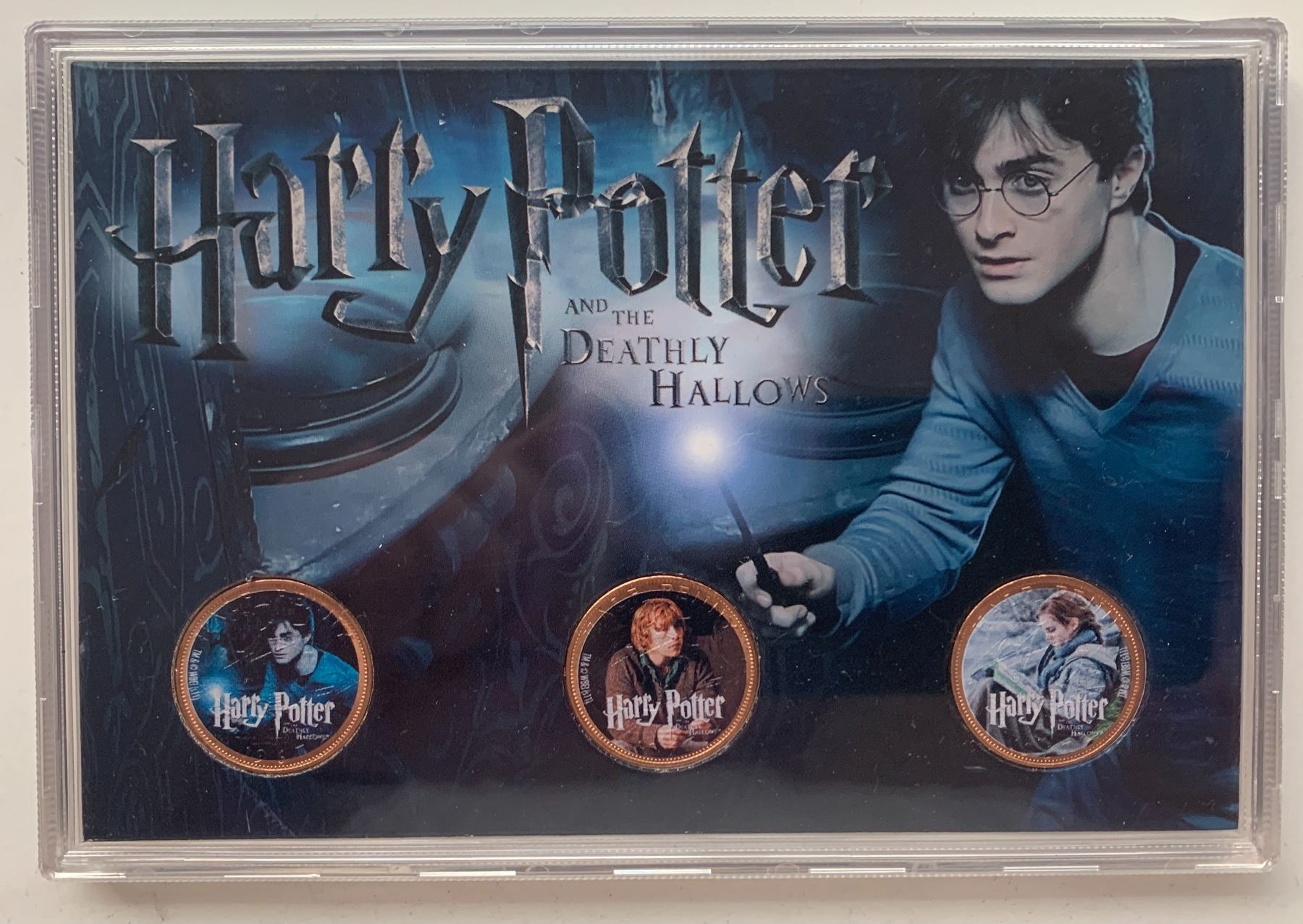 Harry Potter Deathly Hollows British Penny commemorative coin set. 4x6 inches