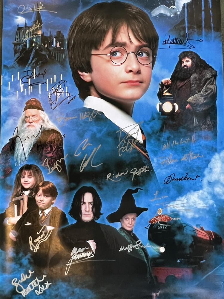 Harry Potter The Sorcerer's Stone cast signed movie poster autographed by Daniel Radcliffe, Emma Watson, Rupert Green, Maggie Smith, Alan Rickman, Tom Felton, Robbie Coltrane, Richard Griffiths, Bonnie Wright, Oliver Phelps, Chris Columbus, James Phelps, Julie Walters, John Cleese, John Hurt, Matthew Lewis, Warwick Davis, and Richard Harris. 24x37 inches