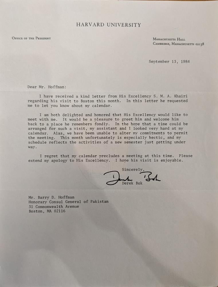 Harvard President Derek Bok Signed Letter. 9x11 inches