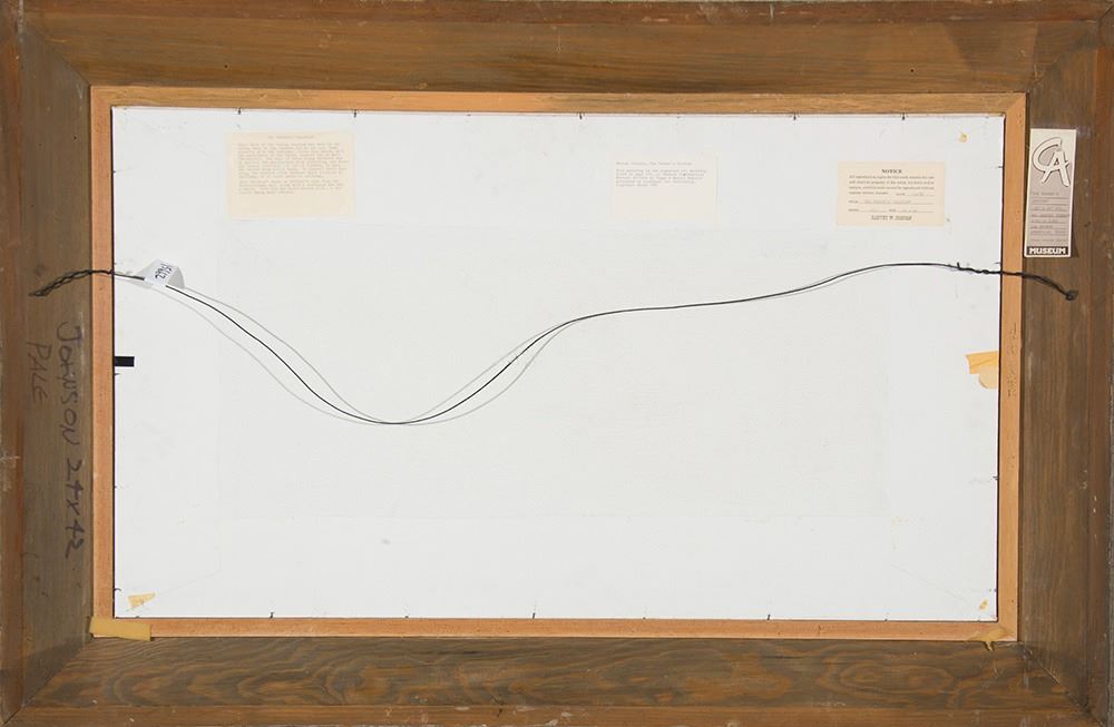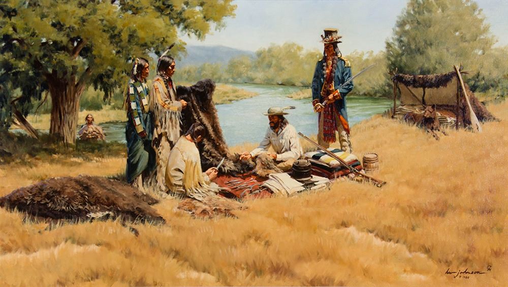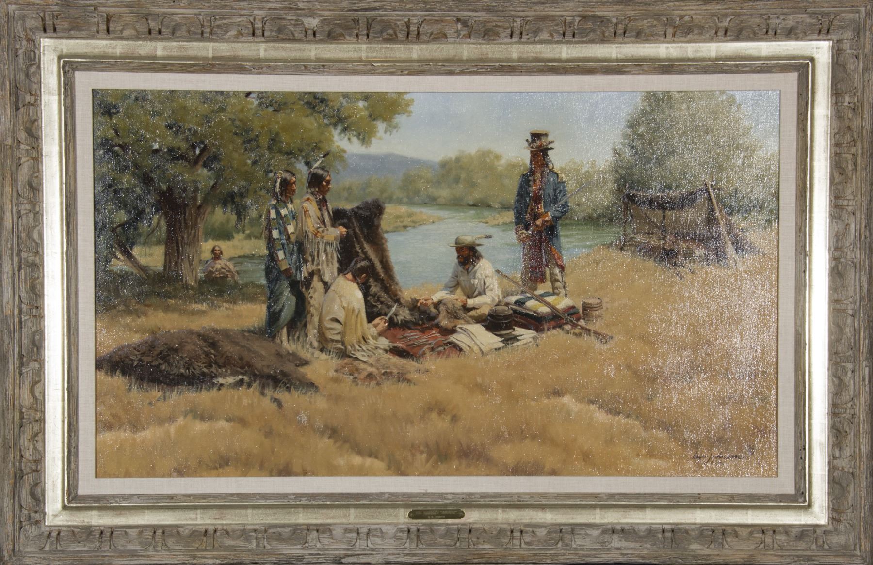 Artist: Harvey Johnson; Title: The Trader's Soldier; Medium: Oil on board; Dimensions: 24 x 42 inches; Signed: Signed/CA and dated 1980 lower right; Verso: Long description of the painting verso; Framed/Base: 35 x 53 inches