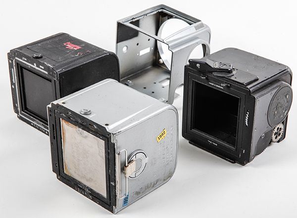 Hasselblad -- Balance of Consignment. Four Hasselblad camera accessories 2 with Velcro patches indicating that they were used by NASA in training or likely flown. 1) Silver film magazine P/N SEF 33101018-301, S/N 1026. 2 Velcro strips on the body and one on the slide. A yellow 1992 sticker and blue 1995 sticker also affixed. (This magazine shows some corrosive discoloration / residue on the camera mount side and on the slide and needs cleaning / restoration.) 2) Silver film magazine pained black PN SEF 33101018-301, S/N 1038. 2 Velcro strips on the body, no slide. Unsure why this magazine was painted and paint is scrapped off in some places. 3) 2000F black Hasselblad film magazine, used and missing compartment cover. 4) 2000F silver Hasselblad film magazine casing. Plus a new roll of Fujicolor role of 220 film.