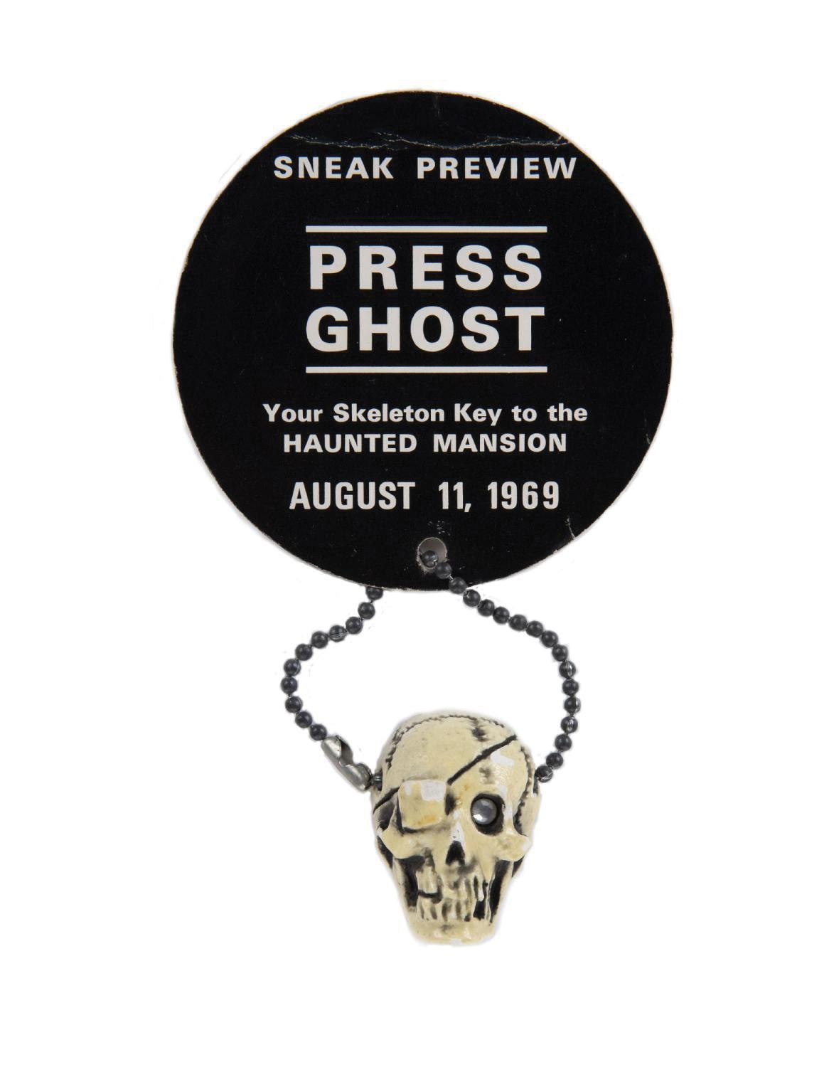 (Disneyland, 1969) An extremely rare "Press Ghost" sneak preview invitation for members of the press to see the Haunted Mansion on August 11, 1969. This press invitation reads "Your Skeleton Key to the Haunted Mansion" and is still attached to the skull keychain. The skull measures 1.75" tall and is in good condition, with a small spot of resin loss to the eyepatch. The circular invitation card has a crease along the top edge but is in very good condition overall.