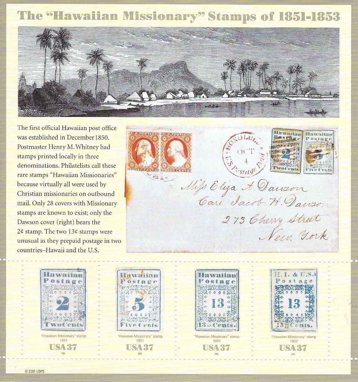 Hawaiian Missionary Stamps, Full Sheet of 4 x 37-Cent Postage Stamps, USA 2002, Scott 3694
