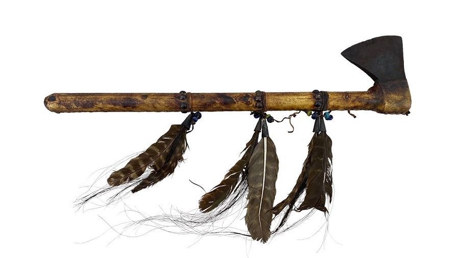 Hawk Shield's name is written in togia on this axe. He was born to Blackfeet parents and led a small band of 25 people as part of John Grass's Band of Blackfeet in the Indian Wars. Hawk Shield and his band surrendered and lived on the Standing Rock Reservation.