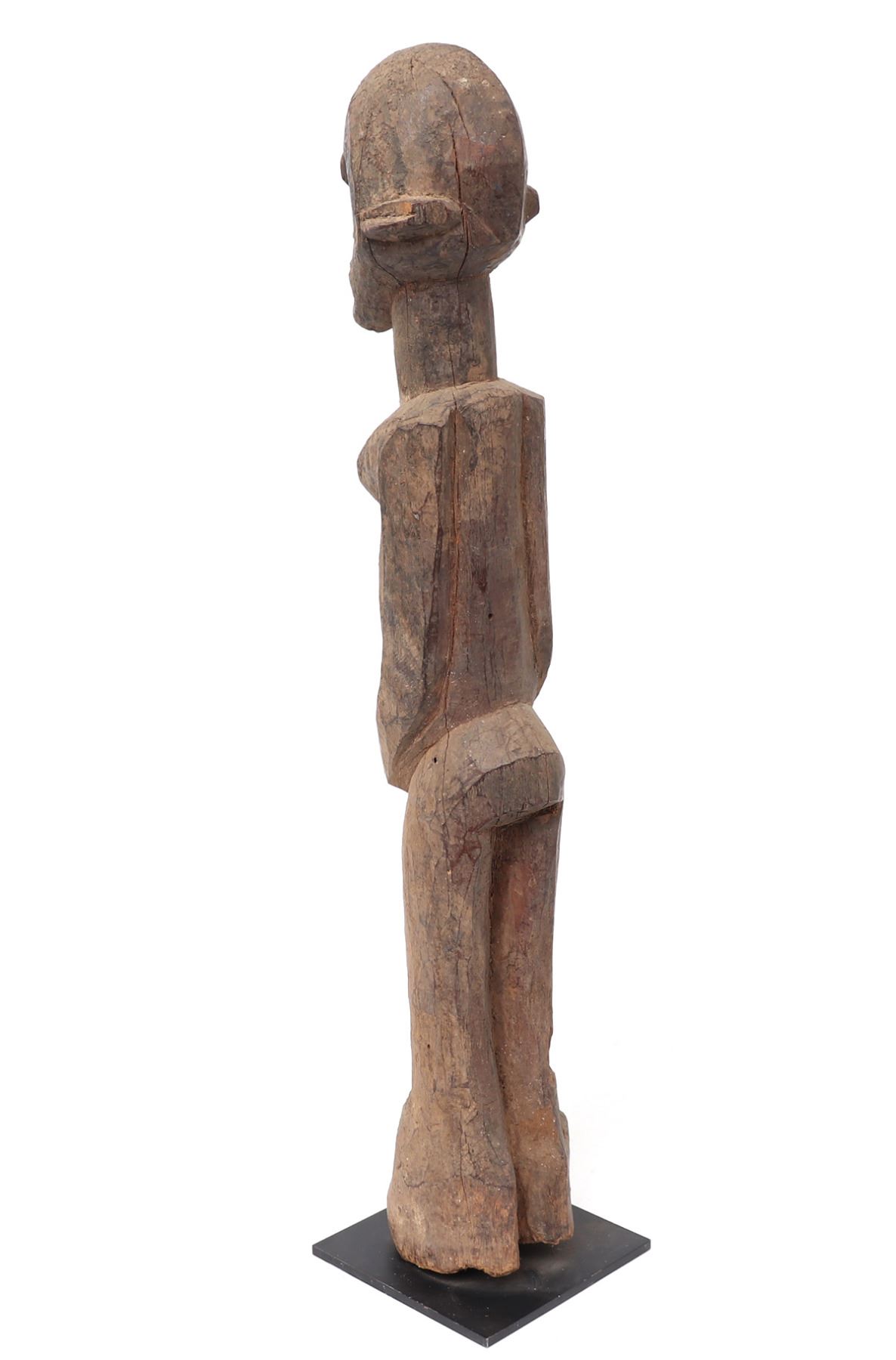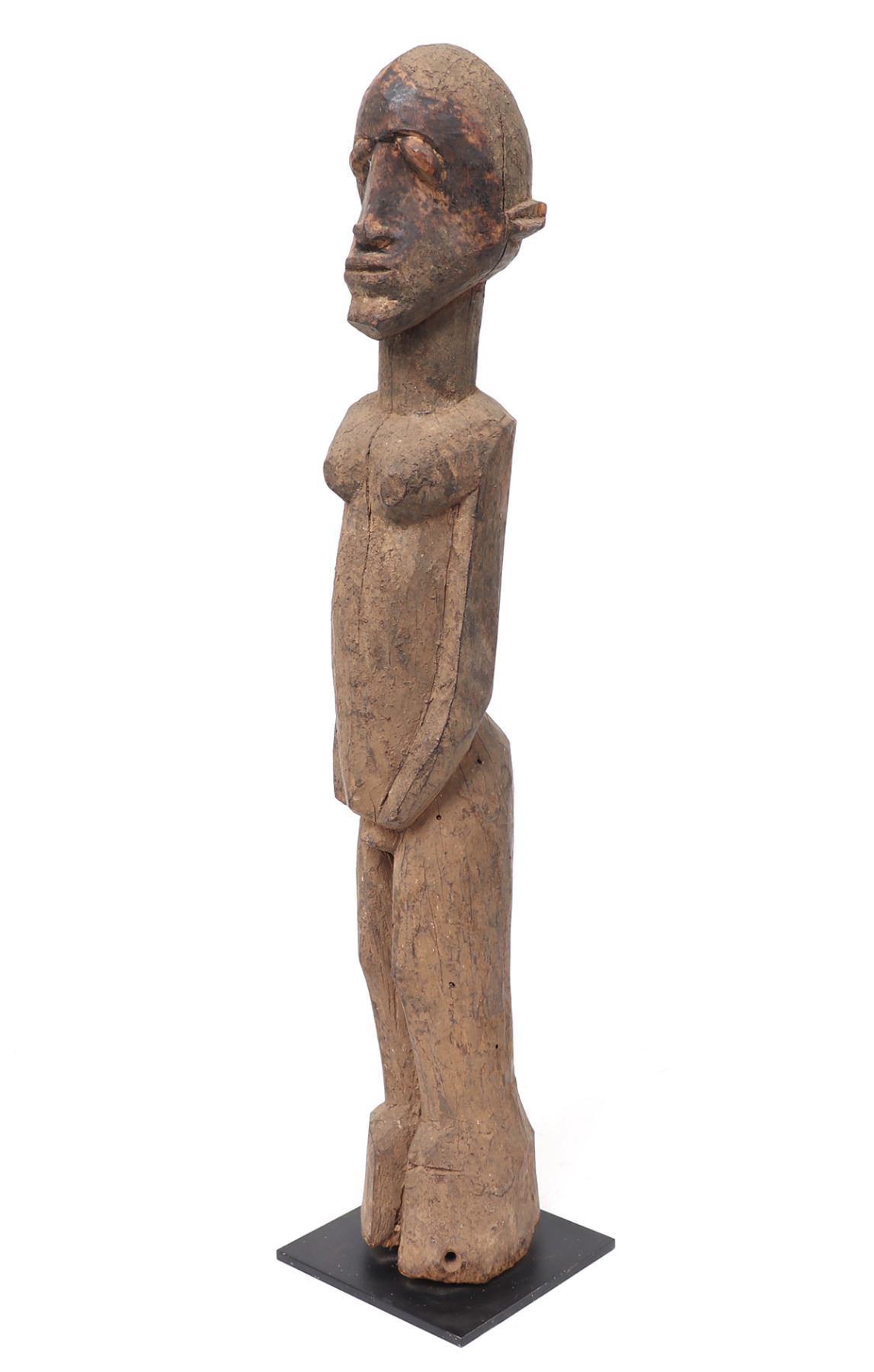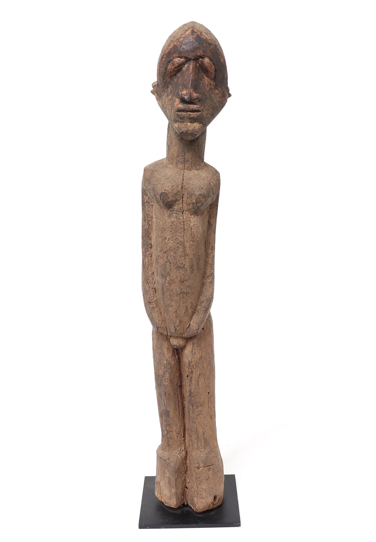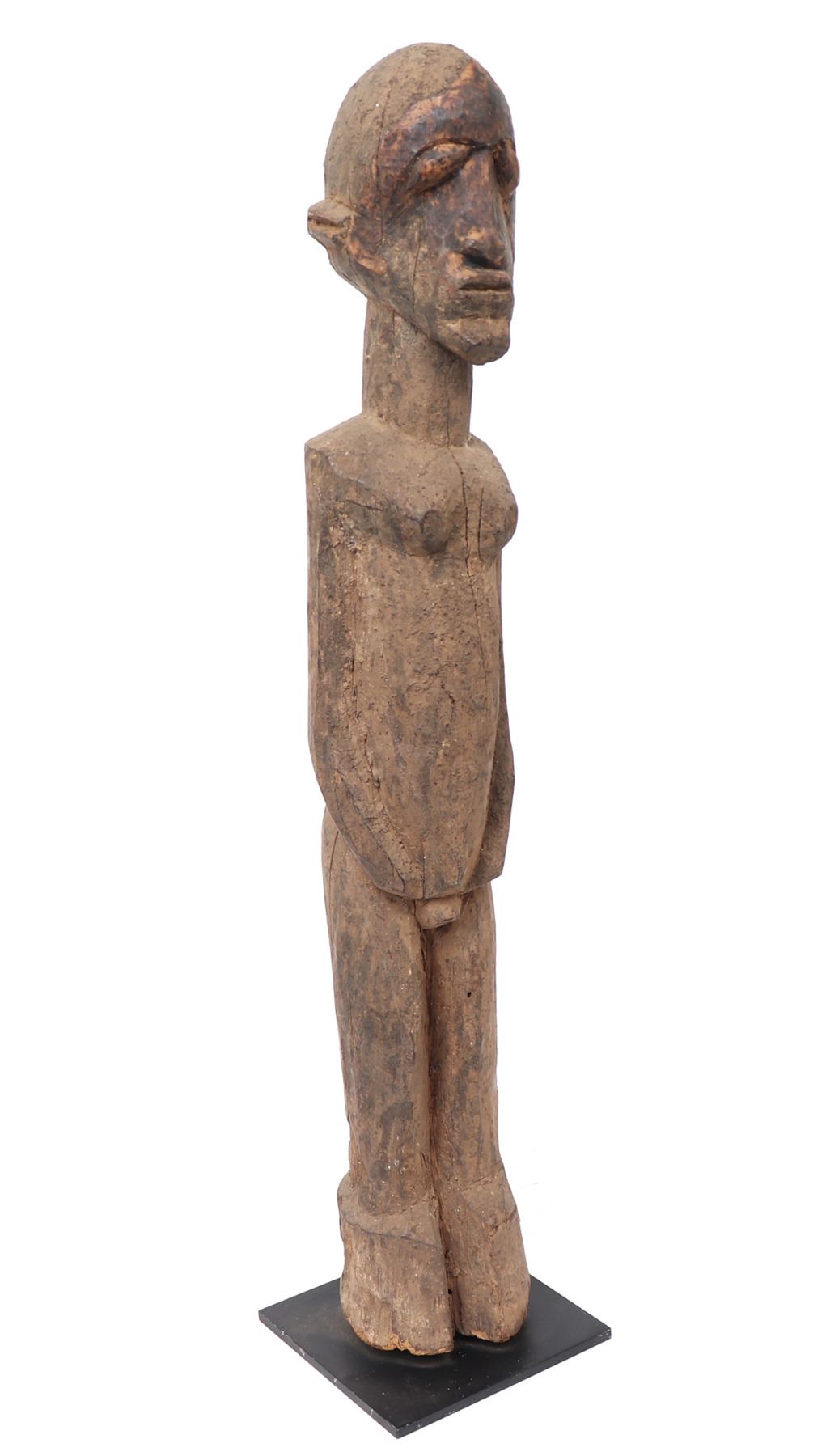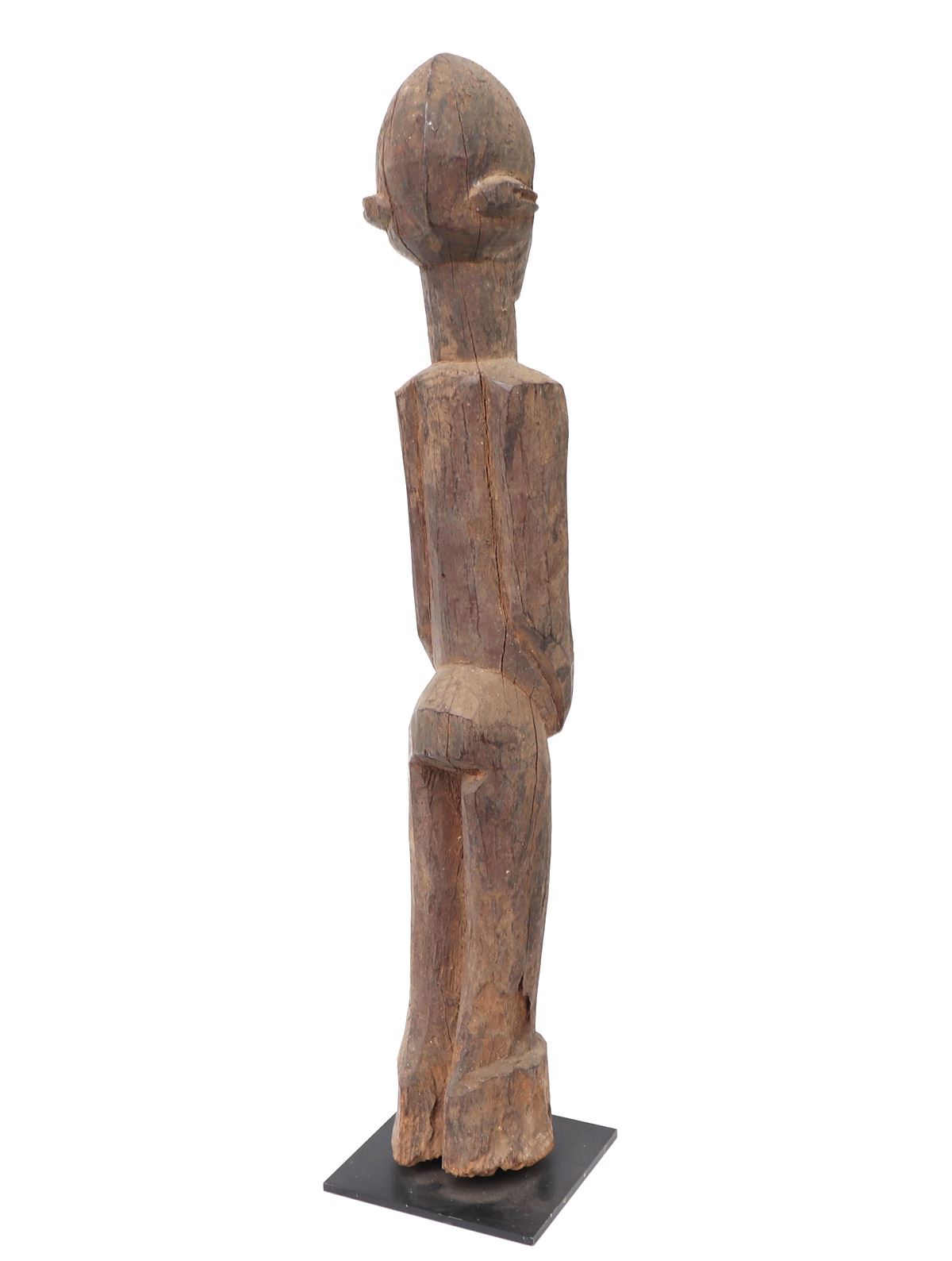 West Africa, Burkina Faso, Lobi Culture, late 19th or early 20th century carved wood standing figure with straight legs and arms brought to his waist. The face with downturned eyes and darkened patina. Size 26" H included on custom stand. Provenance: Ex-Southern California Collection