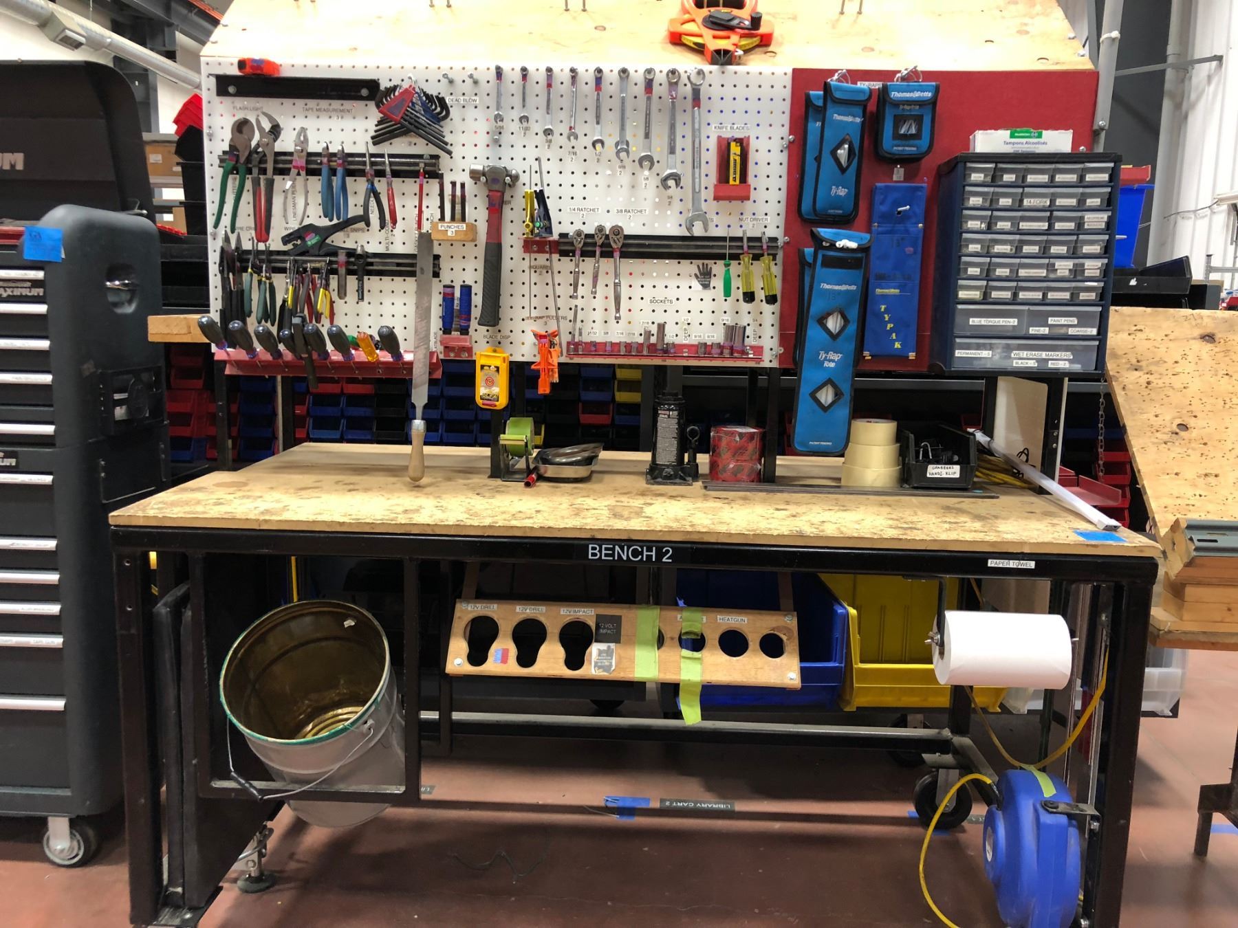 Heavy duty custom rolling work bench 72" x 36" x 73" powder coat black paint, wired with receptacles & includes assorted tools