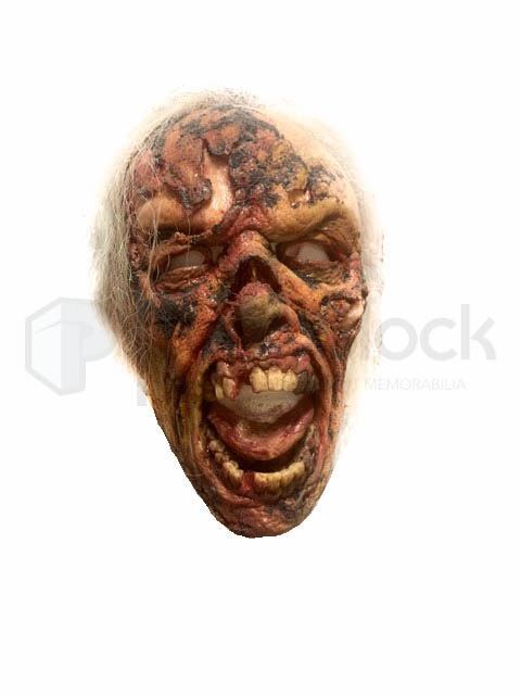 Full witch head appliance featured in the 2019 rebooted film Hellboy. Based on the graphic novels by Mike Mignola, Hellboy, caught between the worlds of the supernatural and human, battles an ancient sorceress bent on revenge. This piece, made of foam latex features the likeness of an old witch that has been burned, with melted skin, char marks and burnt grey hair. This piece shows slight wear from use on set, but remains in excellent, production used condition.