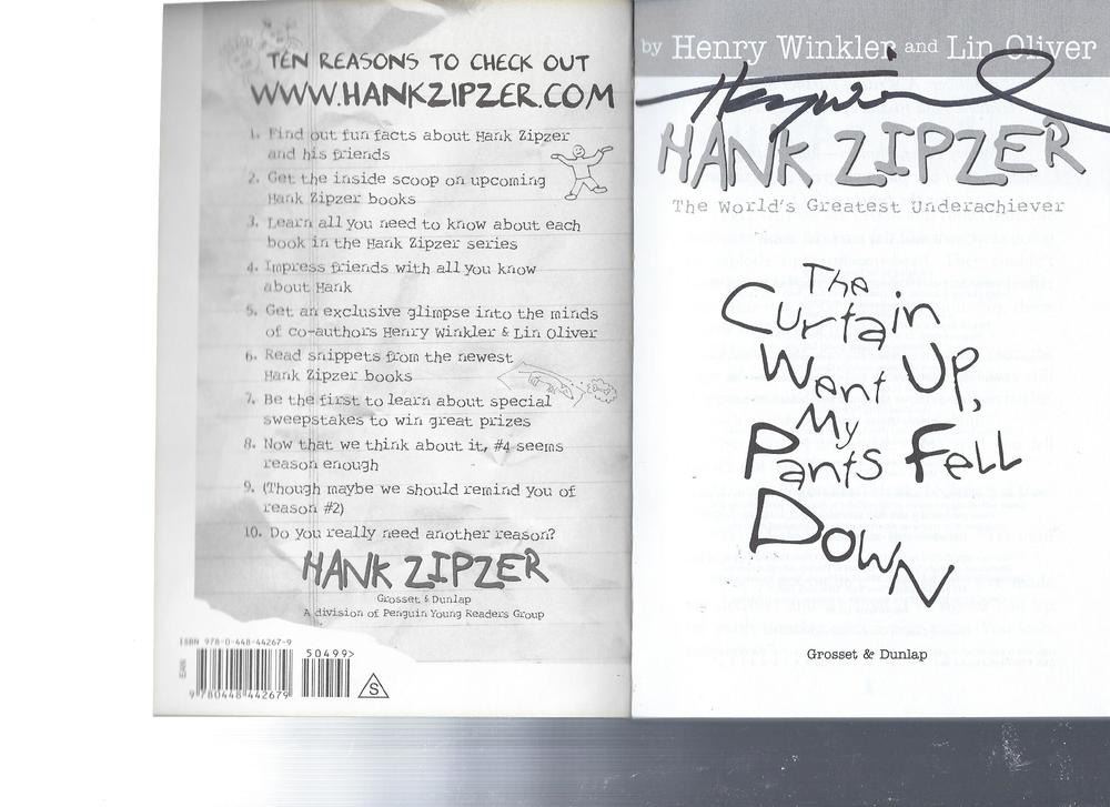 Hank Zipzer; The World's Greatest Underachieve: The Curtain Went Up, My Pants Went Down signed book autographed by Henry Winkler