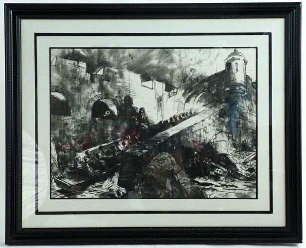 (Disneyland Hotel, c. 2000's). A beautiful print of Herb Ryman's original concept art for Disneyland's Pirates of the Caribbean. Prints like this were made only for display in the Disneyland Hotel. After a major restoration project for the hotel, some of these prints were salvaged. The print and accompanying frame are in good condition with normal wear from age and use. The print measures approximately 53.5" x 44.5".