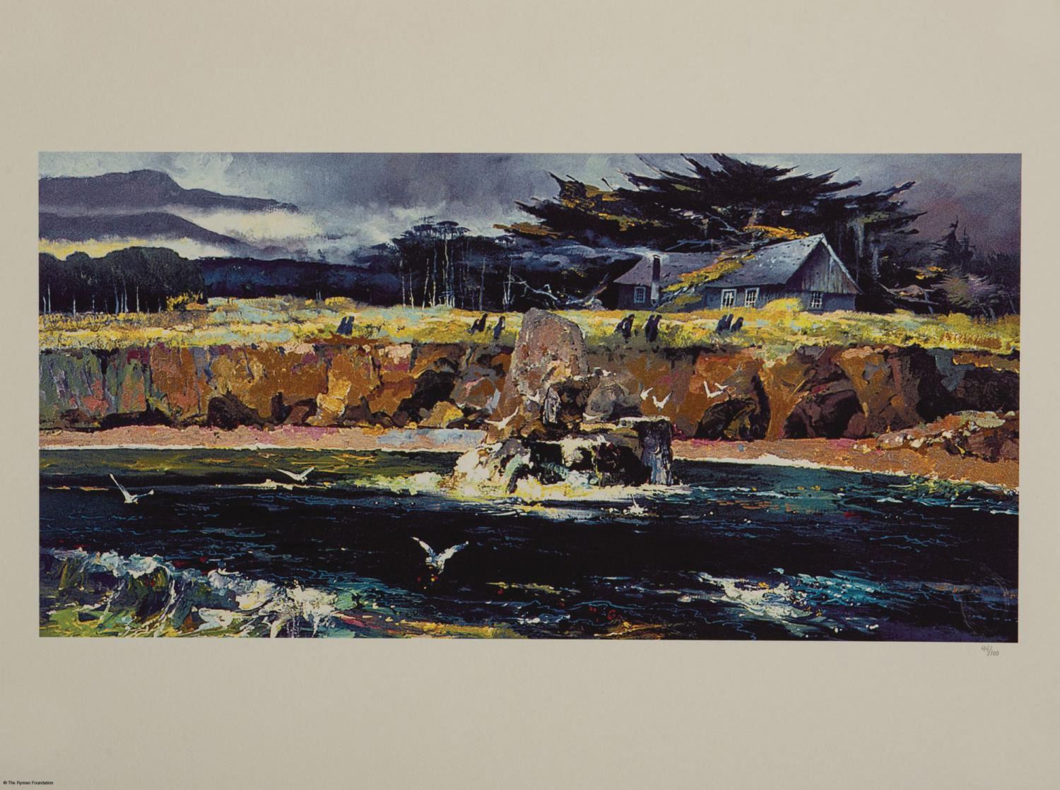 (Disneyland, 2000) A limited edition giclee print by Walt Disney Legend Herb Ryman, titled "Whaler's Cottage." This high quality reproduction of Ryman's original oil on canvas painting was commissioned through The Ryman Foundation and sold in The Disney Gallery at Disneyland Resort. Widely known for his ability to translate Walt's ideas into drawings, this wonderfully atmospheric landscape piece offers a captivating depiction of the coastline in Point Lobos, California. Measuring 18"x24" with an image area of 11"x22", the piece is hand-numbered 44/100, and is in very fine condition, with its Certificate of Authenticity included.