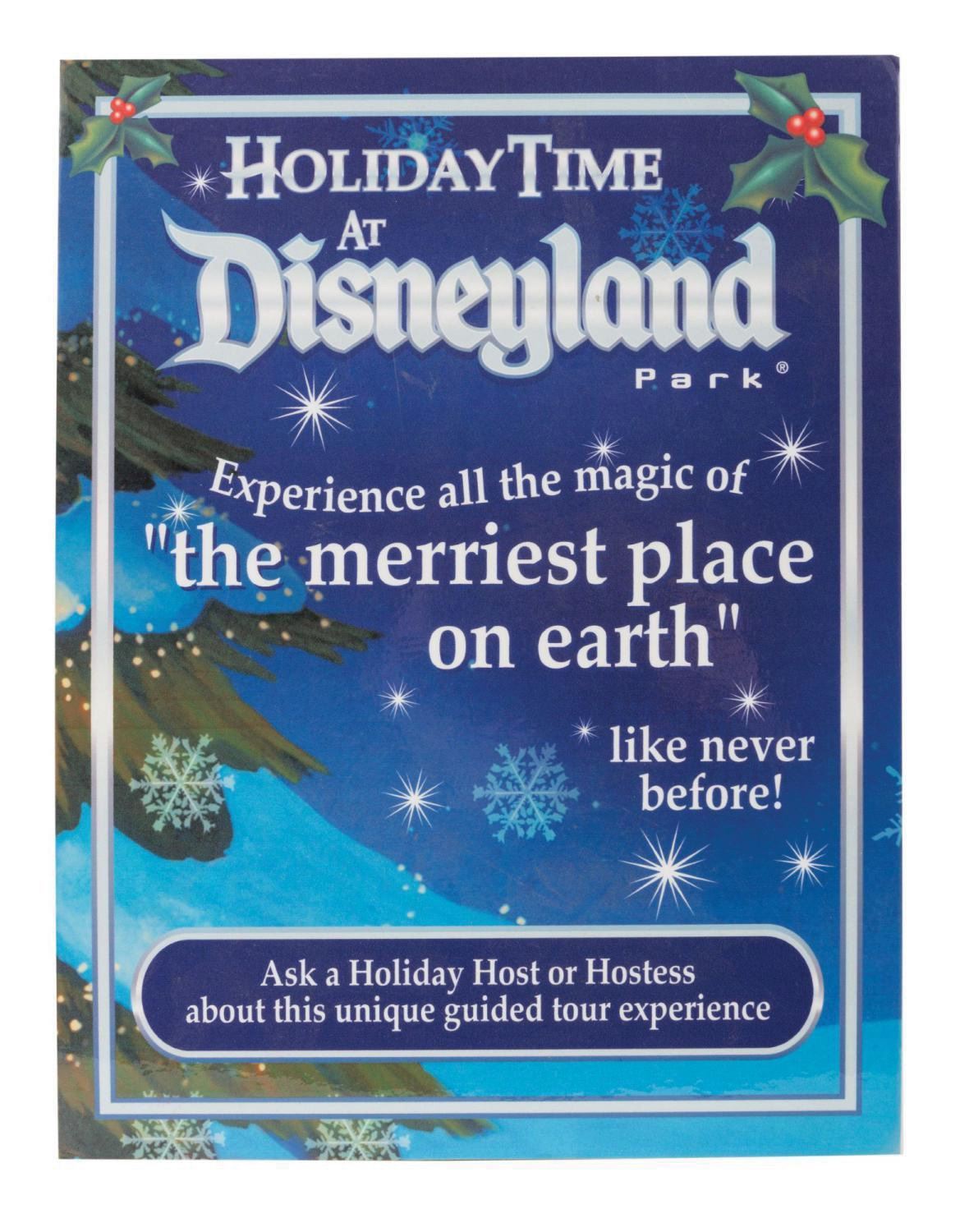 (Disneyland, c.2012) A "Holiday Time at Disneyland Park" sign heralding the unique Guided Tour experience available. Measuring 11"x8.5" the glossy foam core sign decorated with snow-covered branches, snowflakes, and sprigs of holly is in fine condition with few scuffs and wear, and unpunched stand on reverse.