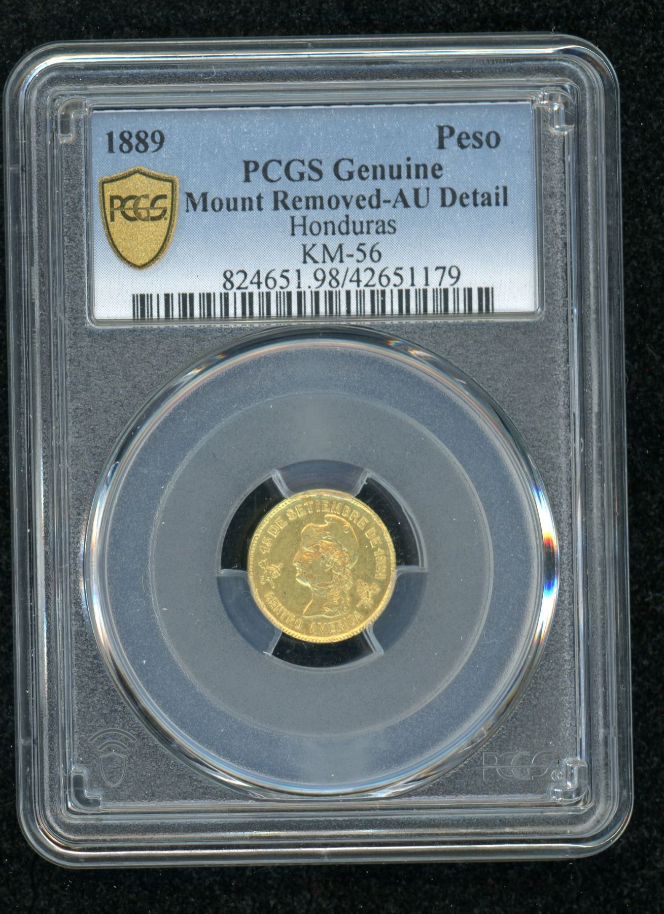 Honduras One Peso Gold of 1889, KM.56, PCGS certifed AU Detail with mount removed from obverse center. A new discovery example for this rare issue, with reported mintage of just five pieces.
