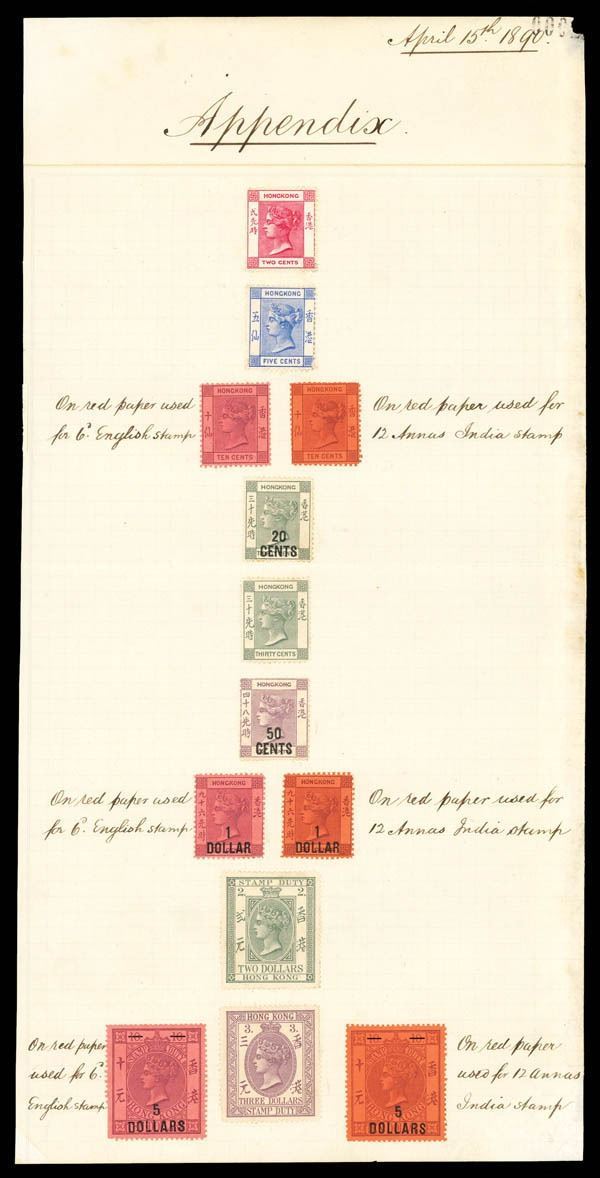 Hong Kong, 1890 (dated Apr. 15), magnificent and unique De La Rue Archives appendix sheet
