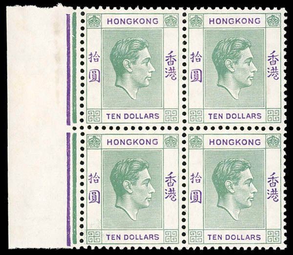 Hong Kong, 1938, King George VI, 10 green & violet, broken Hong variety Scott 166 var, left margin block of 4, as noted in Webb, position R5/1LP, the lower left stamp here; the block fresh and clean; hinged upper left stamp only, the other three including the variety never hinged; gum toned as often encountered, still Very Fine.