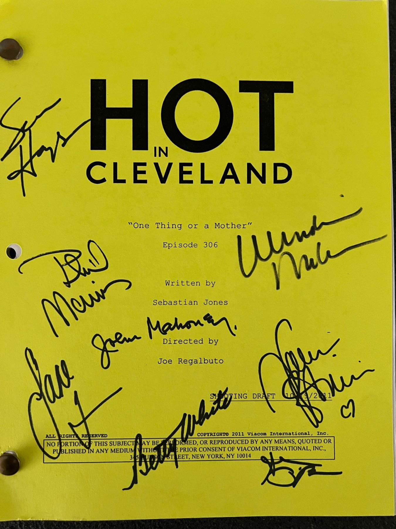 Hot in Cleveland cast signed script autographed by Sean Hayes, John Mahoney, Phil Morris, Valerie Bertinelli, Jane Leeves, Wendie Malick, Jennifer Love Hewitt, Sean O'Bryan and Betty White.