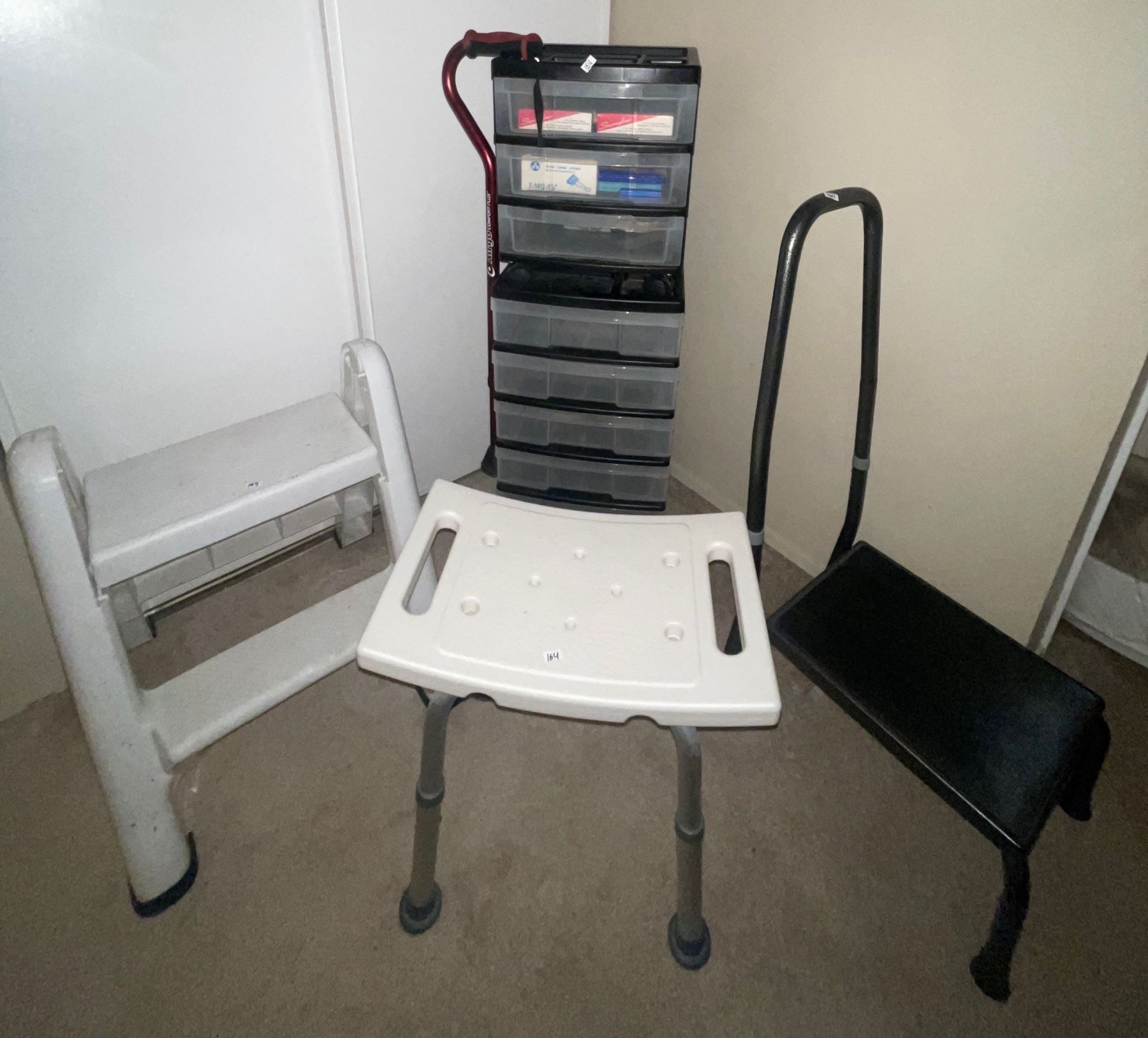 House & Home Items Stool, Bath Chair Support, Storage Drawers On Wheels, & Stool With Large Bar As A Handle