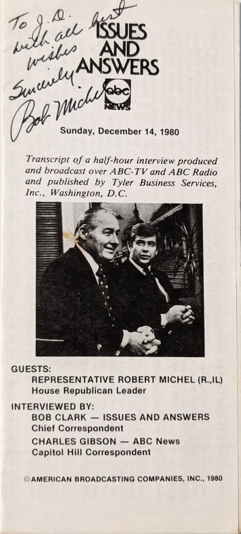 House Republican Leader Robert Michel Signed ABC Transcript. 4x9 inches
