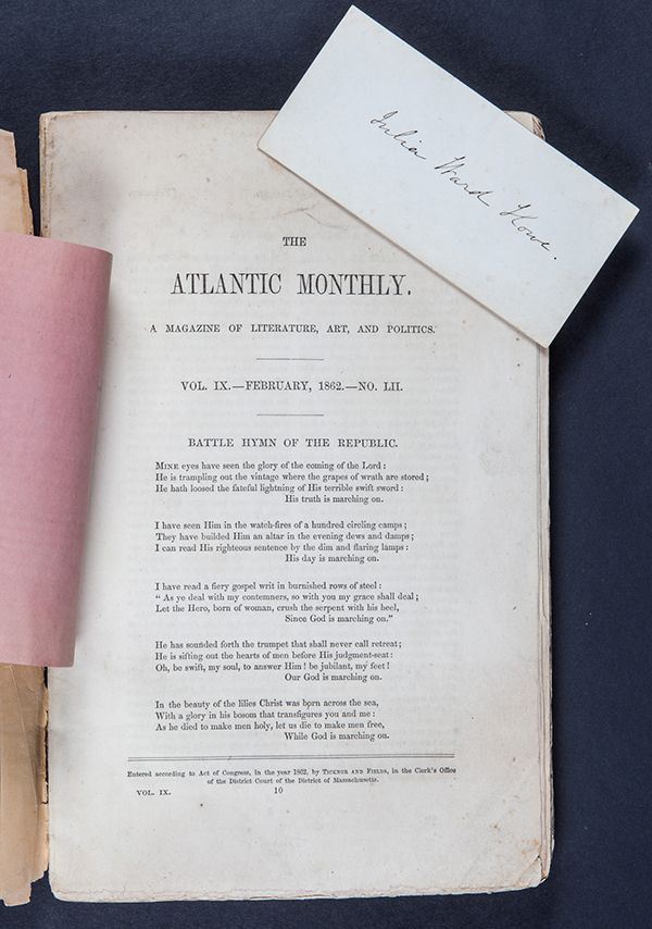 Howe, Julia Ward (1819-1910) Writer, poet, reformer, and lecturer; best remembered for having authored "The Battle Hymn of the Republic." February 1862 issue of The Atlantic Monthly (Boston: Ticknor and Firlds), containing the first printing of "Battle Hymn of the Republic." Paper covers are toned and worn, split at the spine and partially held together with old tape; the inside pages are tightly bound with string and only lightly toned. There are a few marks above "Battle Hymn of the Republic," which is printed as a poem, on the first page of the magazine, having five stanzas. This published version has a few changes from Howe's manuscript version, written in 1861, and a sixth stanza was not included. This poem became the most popular Northern song of the Civil War. With signature of Julia Ward Howe on a 2� x 4�" card.