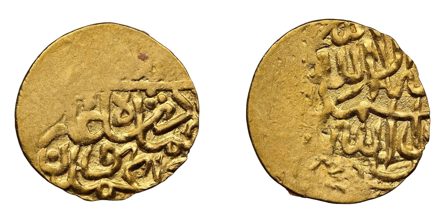Humayun (AH 937-947, 1530-1556 AD), Gold 1/8 Ashrafi,Badakhshan Mint, Obv. khuld allahu taala on top, Muhammad Humayun badshah ghazi, at bottom mulkahu Rev. kalima shahada within dotted border, Graded by NGC as MS 61, Very Rare.