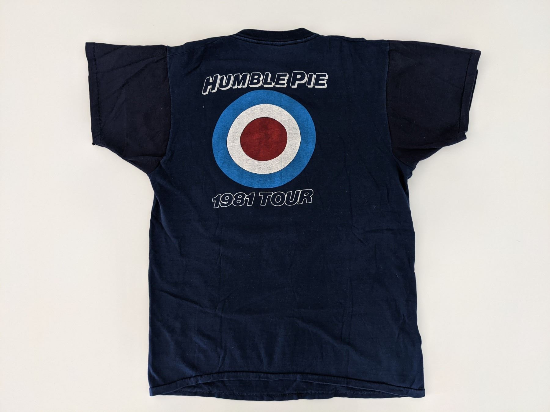 Humble Pie 1981 Tour Shirt Vintage Original Size XL. 100% cotton navy blue short sleeved t-shirt. Collar is a shade lighter for contrast. Printed in white on the front in white is “Humble Pie”, above a British Military plane which was featured on the album artwork for the On to Victory album. In white on the back is “Humble Pie 1981 Tour”, along with a British Air Force insignia in blue, white, and red. Excellent used vintage condition. Measures 21 inches (53.5 cm) pit to pit, 29.5 inches (75 cm) long shoulder to hem, 22 inches (56 cm) across bottom.
