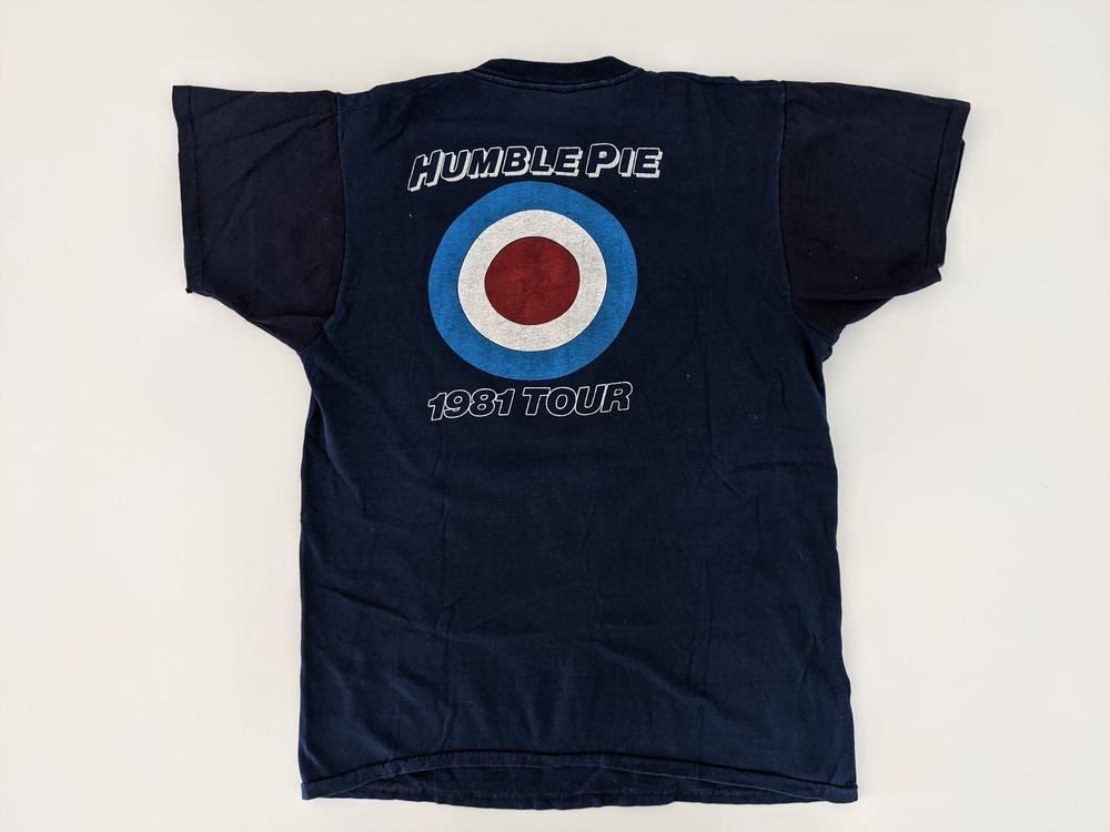 Humble Pie 1981 Tour Shirt Vintage Original Size XL. 100% cotton navy blue short sleeved t-shirt. Collar is a shade lighter for contrast. Printed in white on the front in white is “Humble Pieâ€, above a British Military plane which was featured on the album artwork for the On to Victory album. In white on the back is “Humble Pie 1981 Tourâ€, along with a British Air Force insignia in blue, white, and red. Excellent used vintage condition. Measures 21 inches (53.5 cm) pit to pit, 29.5 inches (75 cm) long shoulder to hem, 22 inches (56 cm) across bottom.