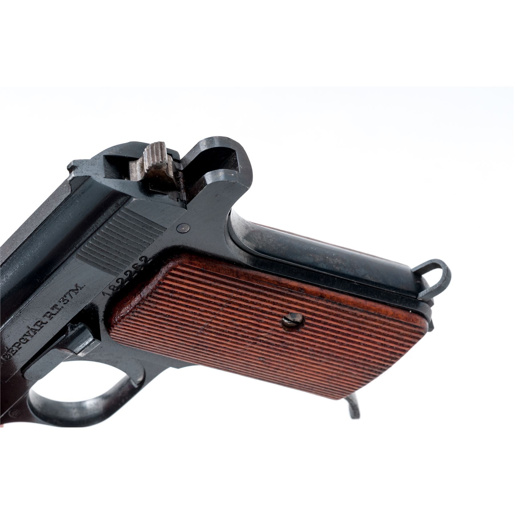 Hungarian Femaru Model 37M Semi-Automatic Pistol, with Czech CZ-52 holster, #182262, .380 ACP cal., 4'' barrel, blue finish, serrated wood grips, standard sights, with one ''37M'' marked magazine. Left side of slide is marked ''FEMARU-FEGYVER ES GEPGYAR R.T. 37M''; left side of triggerguard with ''St. Stephens Crown'' acceptance mark. Included is a ''61'' dated Czech CZ-52 holster with cleaning rod. Approx. 95% original finish remains and pistol rates as very good overall. Metal with general specks of light freckling to the finish. Factory lettering, proofmarks, etc. are clear and defined. Grips show signs of moderate age and wear including scattered small impressions to the serrations. Very good action; bore is moderately pitted but not worn out, rifling is good. CZ-52 holster shows normal age and wear, color on the magazine pouch has thinned, stamp on the inside is clear, stitching is intact. Est.: $300-$500. (C&R)