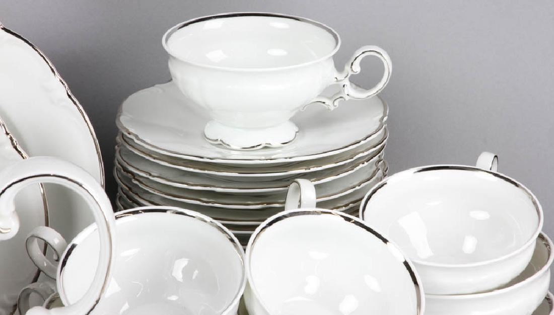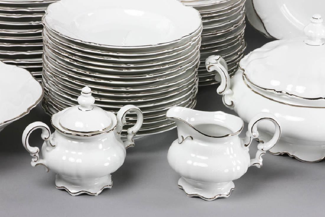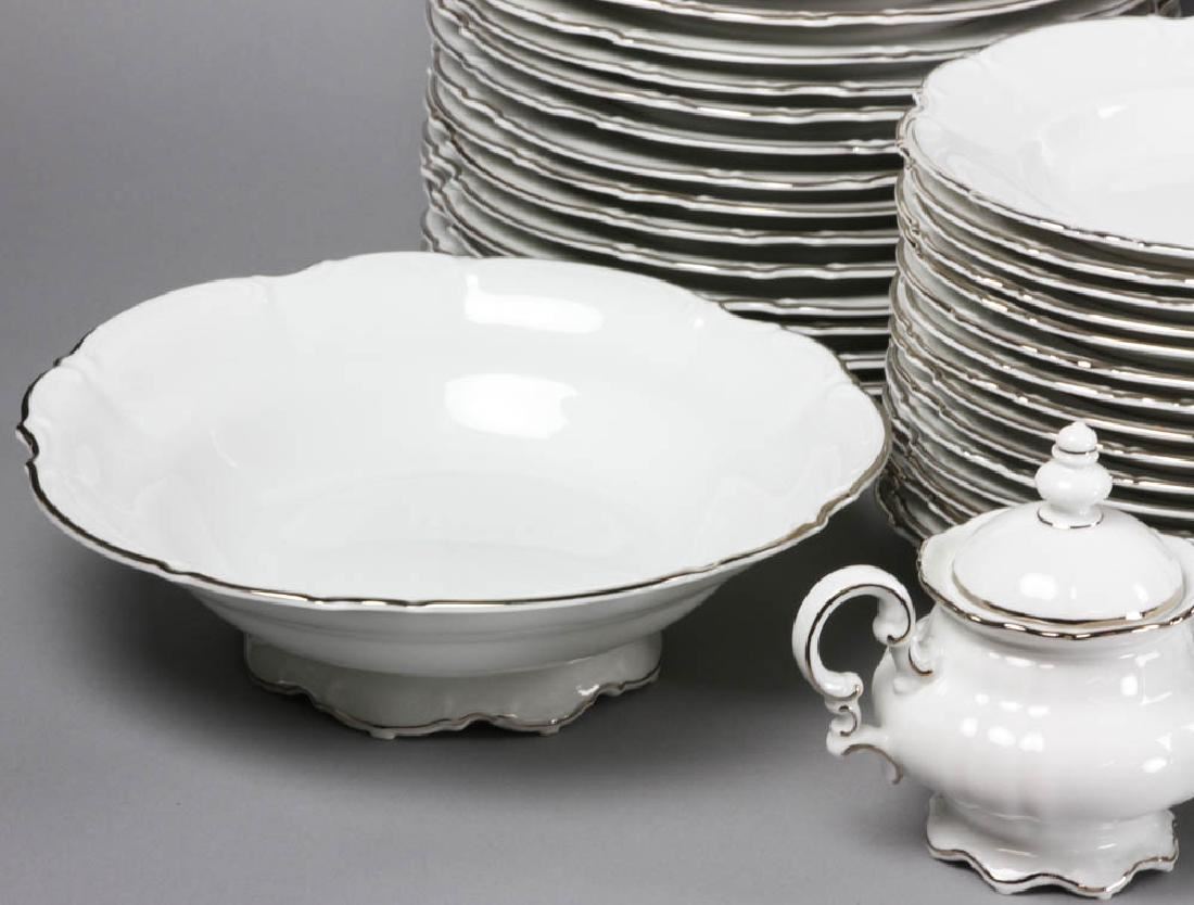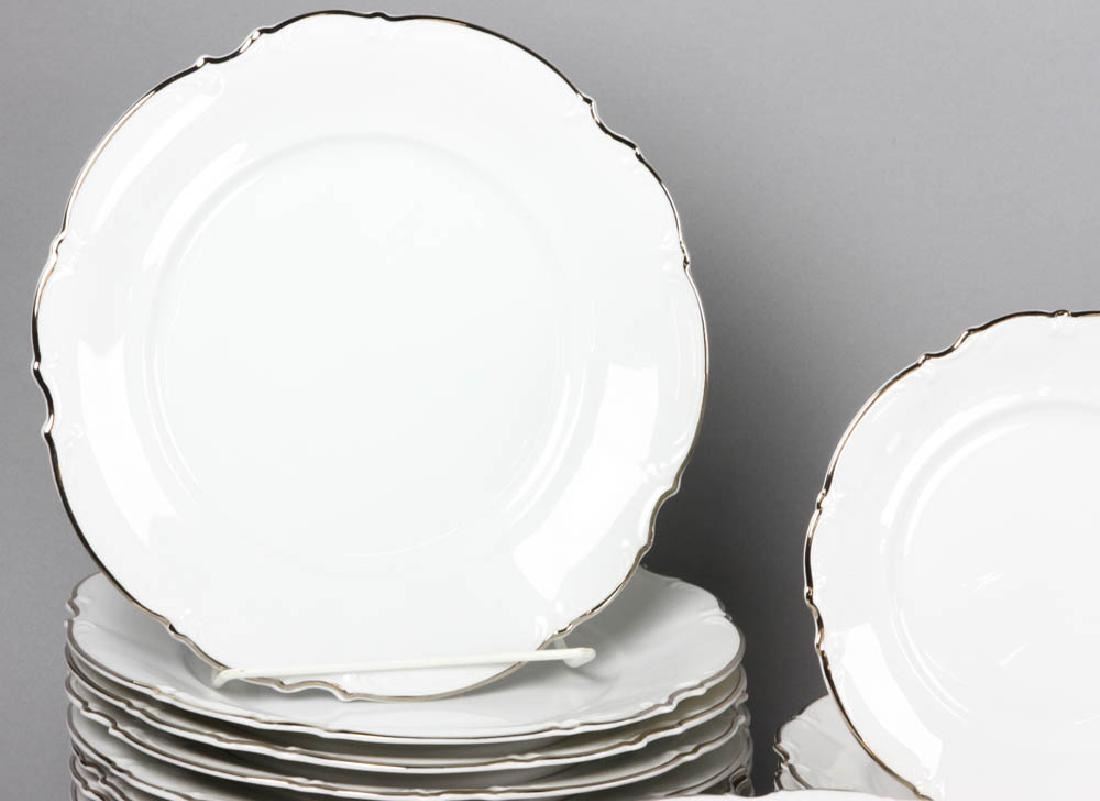 Hutschenreuther china, Lorenz pattern, white ground with silver edge, dinner service for sixteen (16) plus extras and serving pieces, to include: dinner plates, side plates, soup bowls, cups and saucers, two platters, two open vegetable dishes, covered vegetable, teapot, gravy/sauce dish with under tray, cream and sugar, dinner plate measures 10" in diameter. Provenance: Salem, Massachusetts estate.